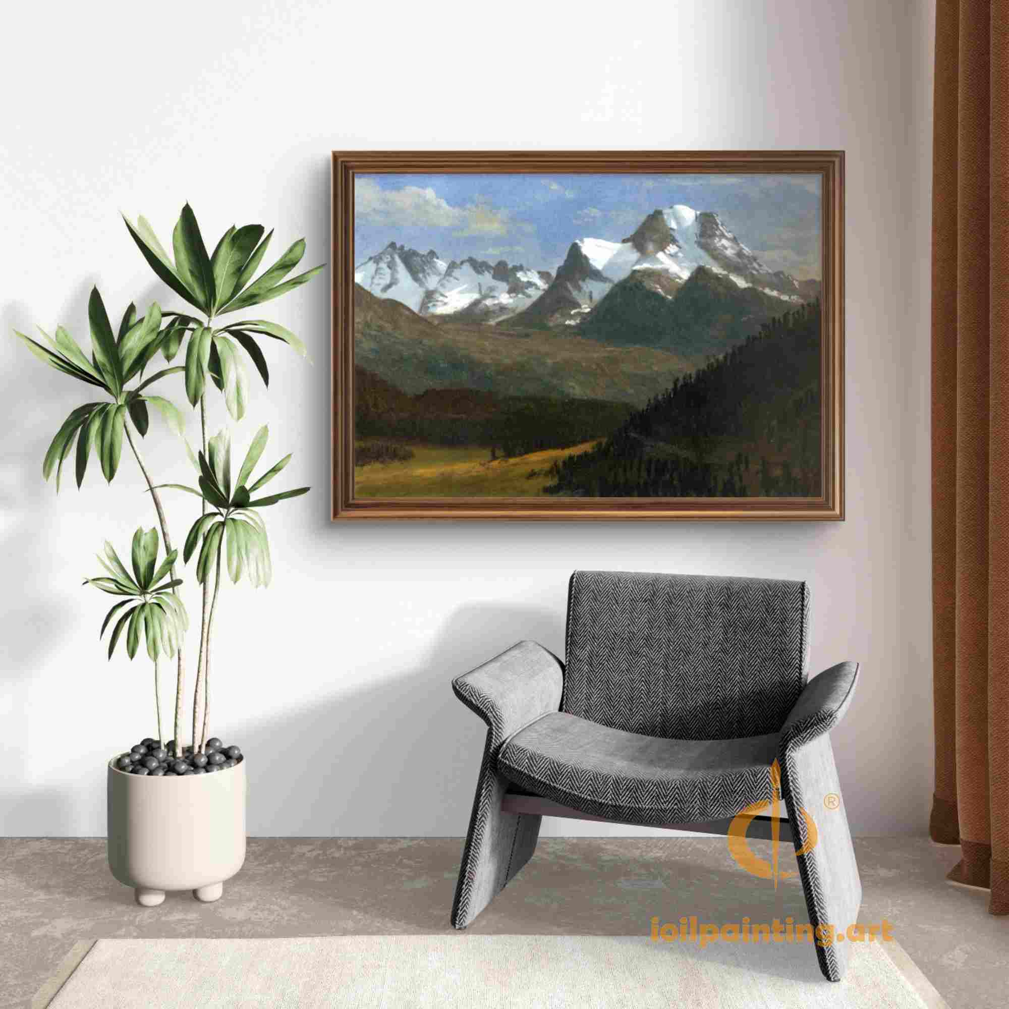 Immerse yourself in the breathtaking grandeur of nature with this exquisite hand-painted reproduction of an Albert Bierstadt-inspired alpine landscape. This magnificent artwork transports you to a pristine wilderness where towering, snow-capped mountains dominate the horizon, their rugged peaks contrasting beautifully with the deep evergreen forests below under a vast, clear blue sky.