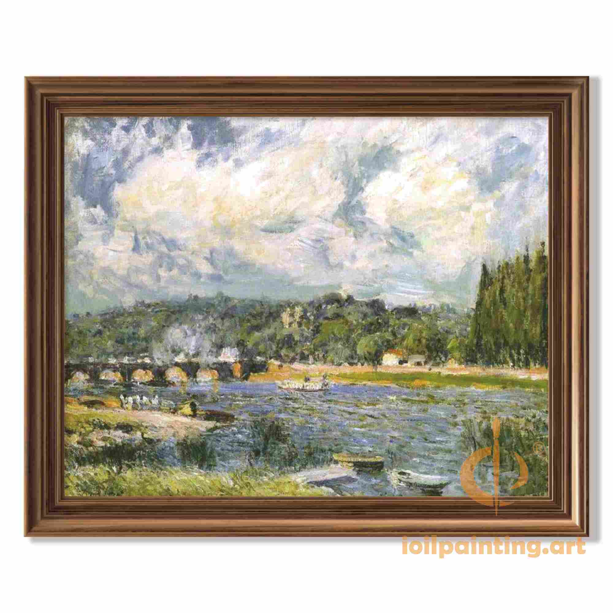 Immerse yourself in the serene beauty of the French countryside with this exquisite hand-painted reproduction of Alfred Sisley's masterpiece, "View of the Bridge at Mantes." This breathtaking artwork captures the tranquil essence of a riverside landscape, where a graceful stone bridge spans gently flowing waters beneath a sky painted with soft, billowing clouds.