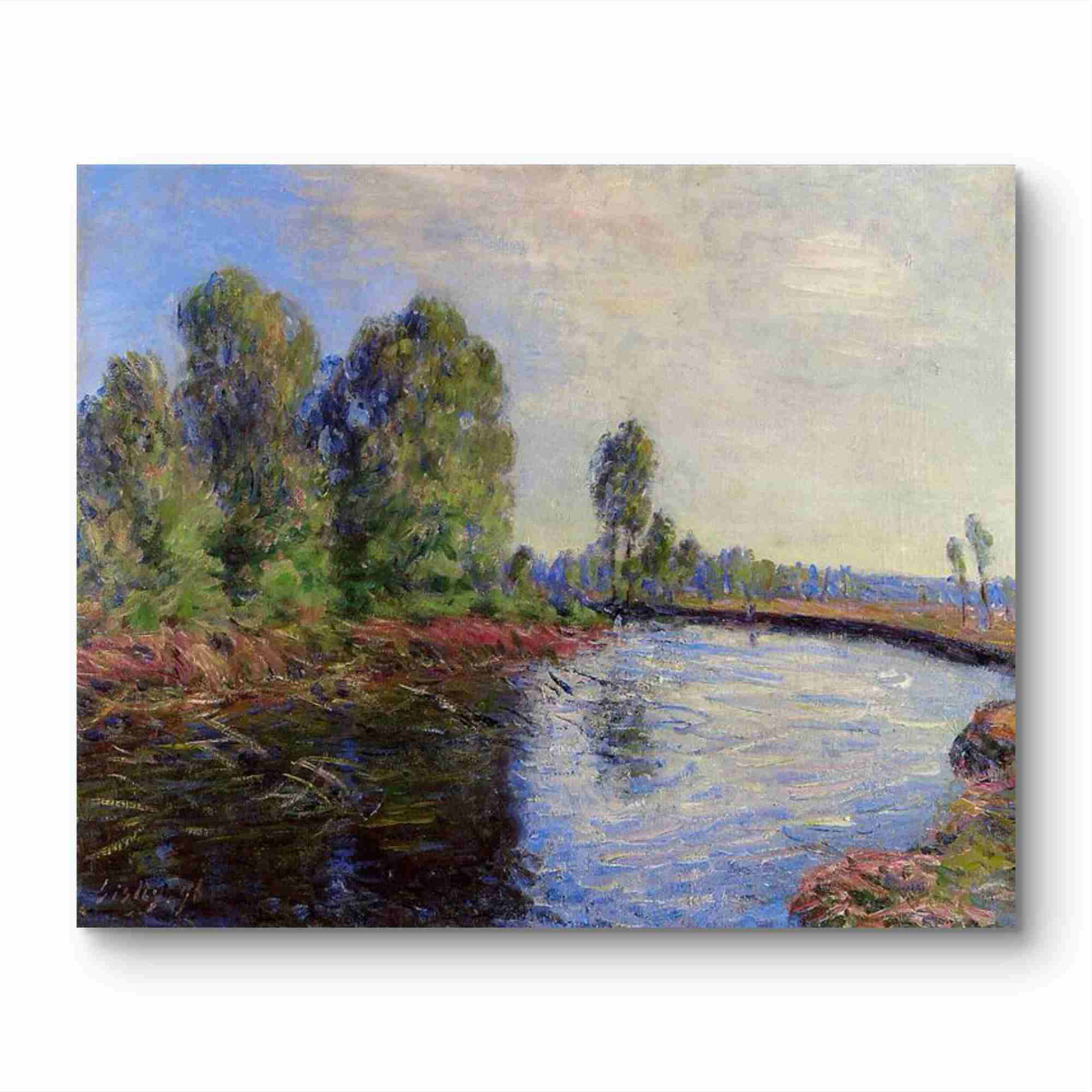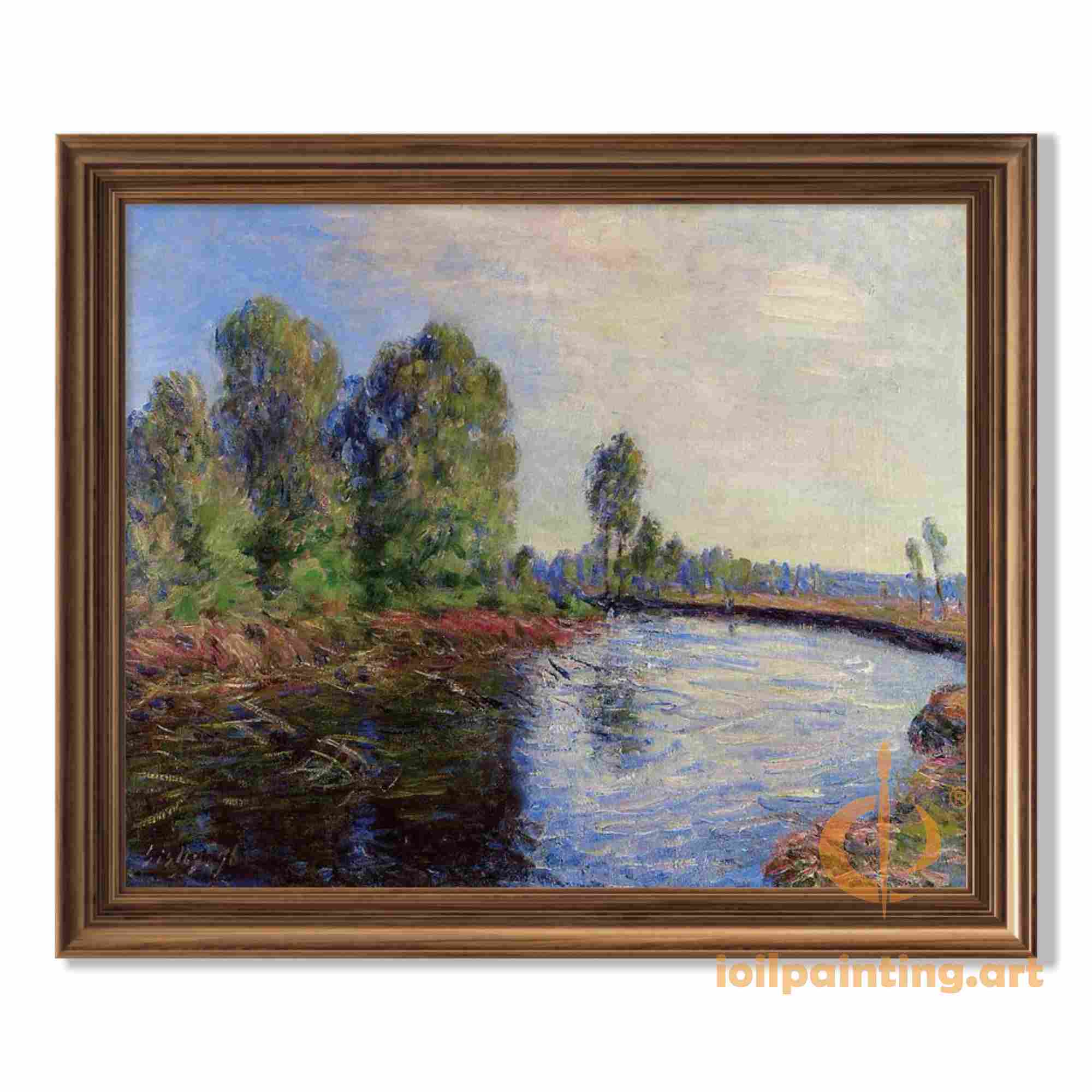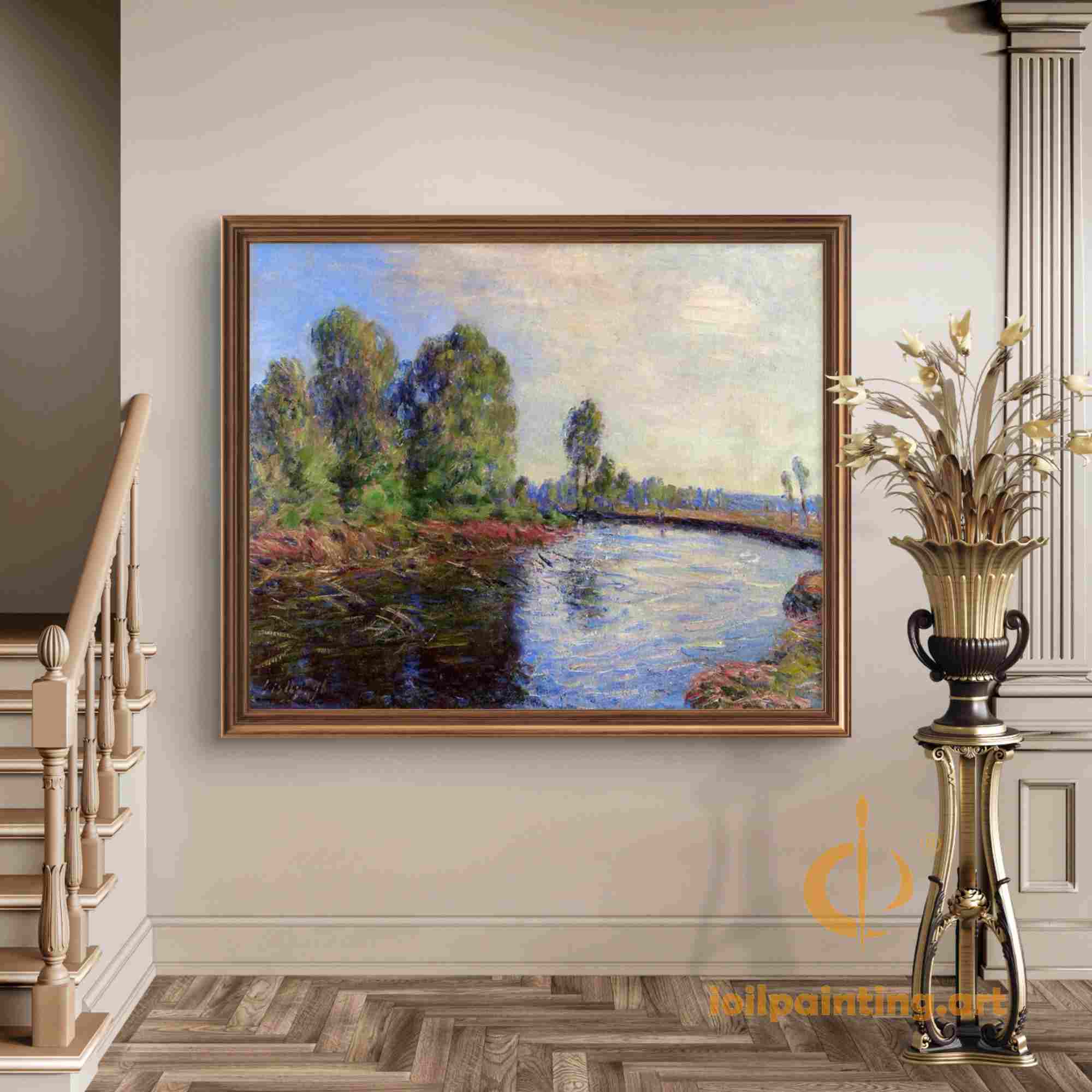 Immerse yourself in the serene beauty of the French countryside with this exquisite hand-painted reproduction of Alfred Sisley's masterpiece. This breathtaking artwork captures the peaceful harmony of a winding river, where shimmering blue waters reflect lush green trees under a soft, luminous sky – a perfect example of Sisley's celebrated impressionist style.