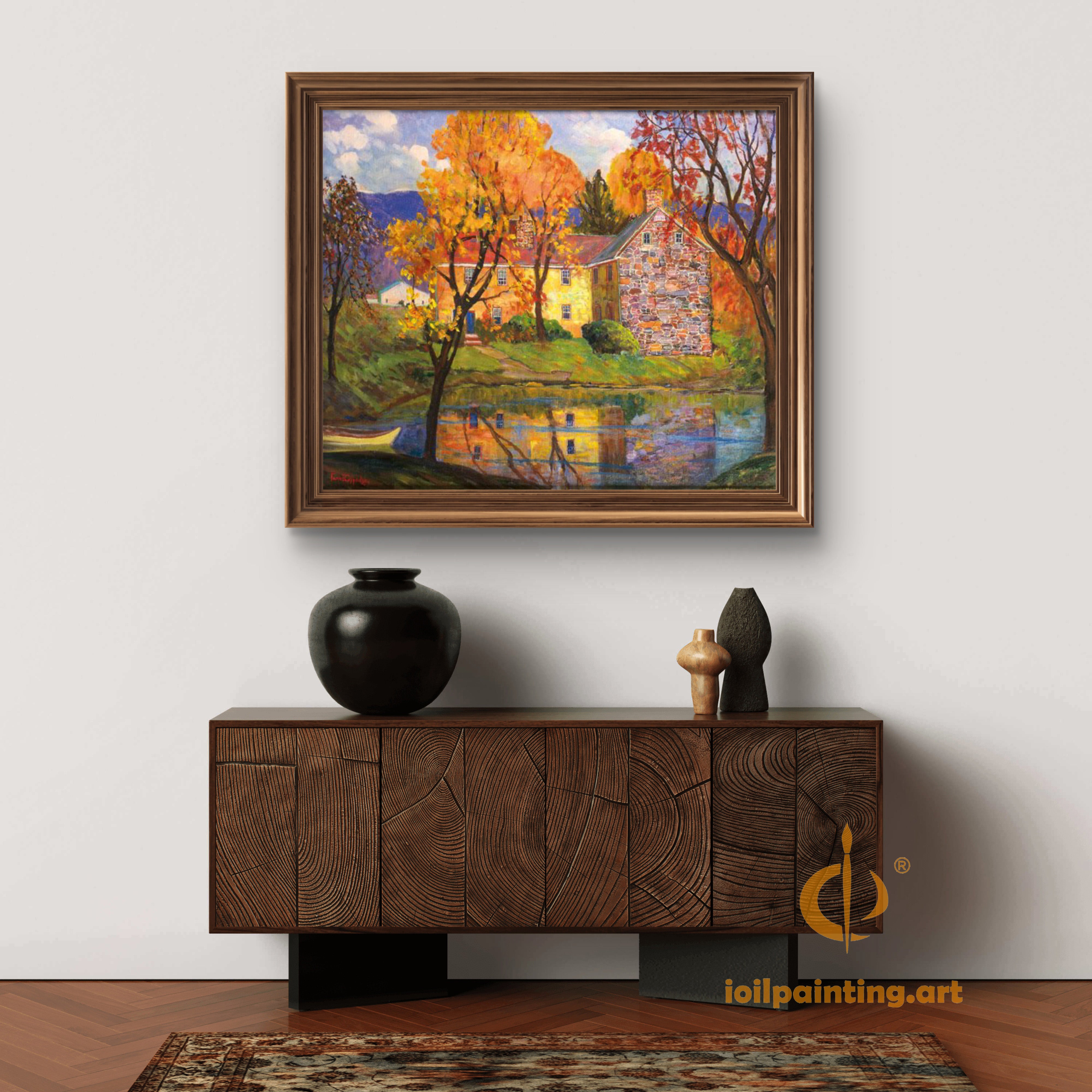 Step into a golden autumn day with this exquisite hand-painted countryside reproduction. This breathtaking artwork transports you to a serene rural retreat, where a charming stone cottage with a warm red roof nestles amidst a vibrant tapestry of autumn foliage. Towering trees dressed in golden yellows and fiery oranges frame the scene, their brilliant colors perfectly mirrored in the glassy lake that graces the foreground.