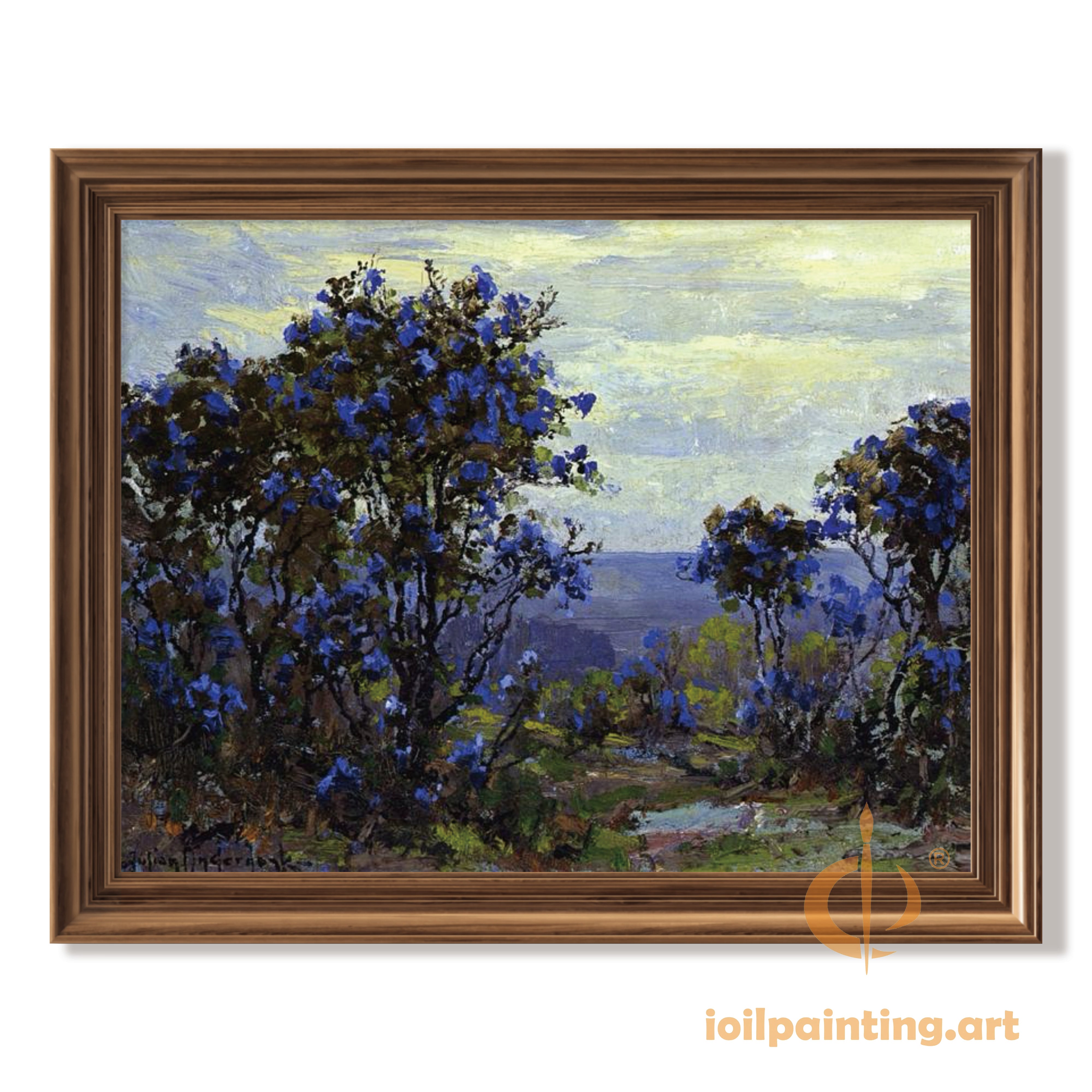 Immerse yourself in the tranquil beauty of nature with this exquisite hand-painted oil reproduction featuring a magnificent tree in full bloom. This breathtaking artwork captures the essence of spring, where vibrant blue flowers cascade from every branch, creating a stunning contrast against the deep brown trunk and lush green foliage. The soft, dreamy sky and distant horizon add depth and serenity to this picturesque scene.