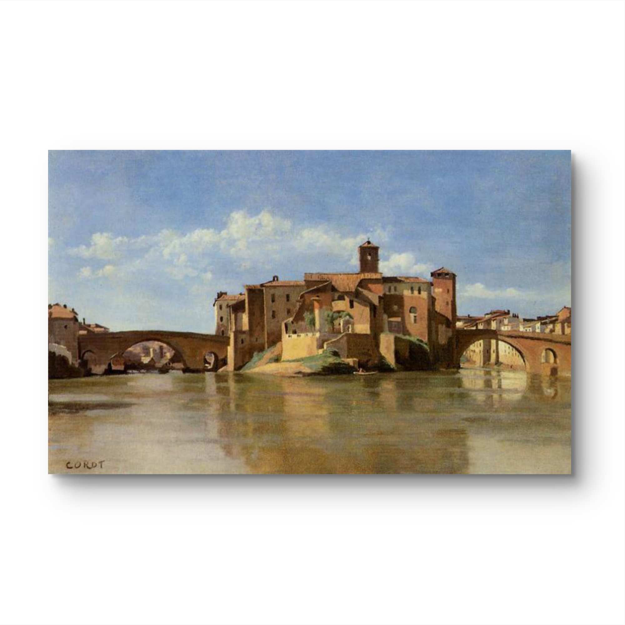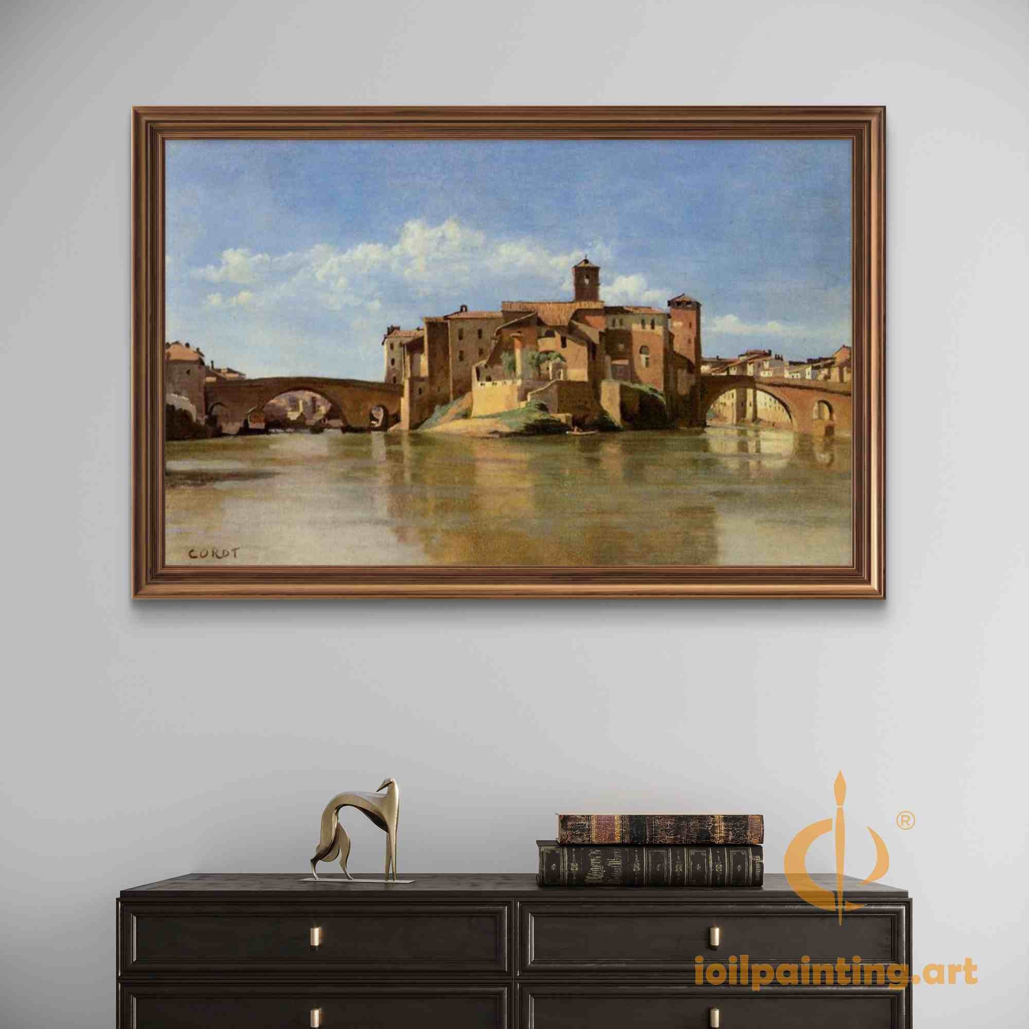 Own This Riverside Treasure - Display in a classic wood frame for traditional authenticity or a black frame for modern contrast. Corot's vision of architectural harmony makes this painting endlessly captivating.
