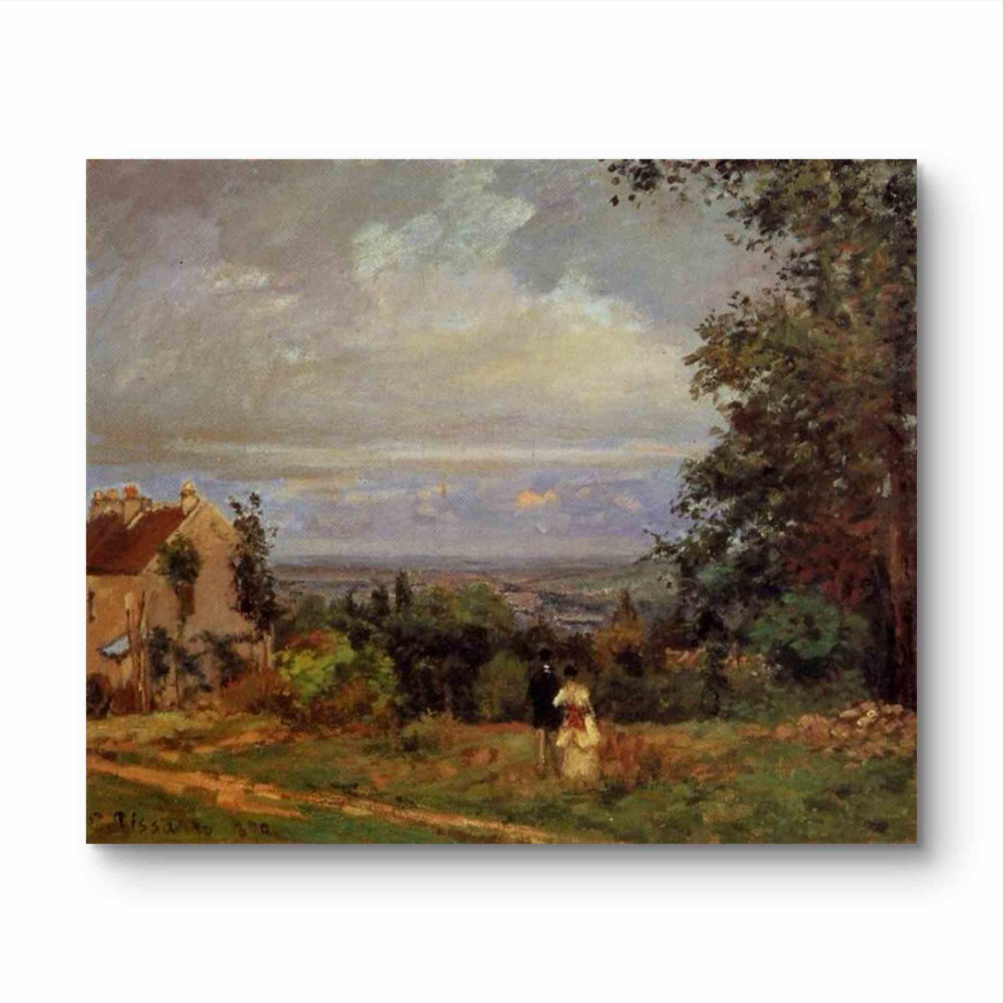 Step into a moment of quiet romance with this exquisite hand-painted reproduction of a Camille Pissarro masterpiece. This breathtaking artwork captures a tender scene where a couple stands together in peaceful contemplation, the gentleman in his dignified dark attire and the lady in her flowing light dress, both admiring the sweeping vista before them. The expansive landscape unfolds with masterful depth - from the lush greenery at their feet to the majestic trees framing the composition, all leading your eye toward distant architectural silhouettes that hint at village life. Above them, a dramatic yet soft sky filled with voluminous clouds completes this poetic scene, perfectly embodying Pissarro's genius for blending human connection with nature's grandeur.