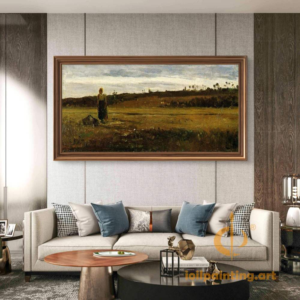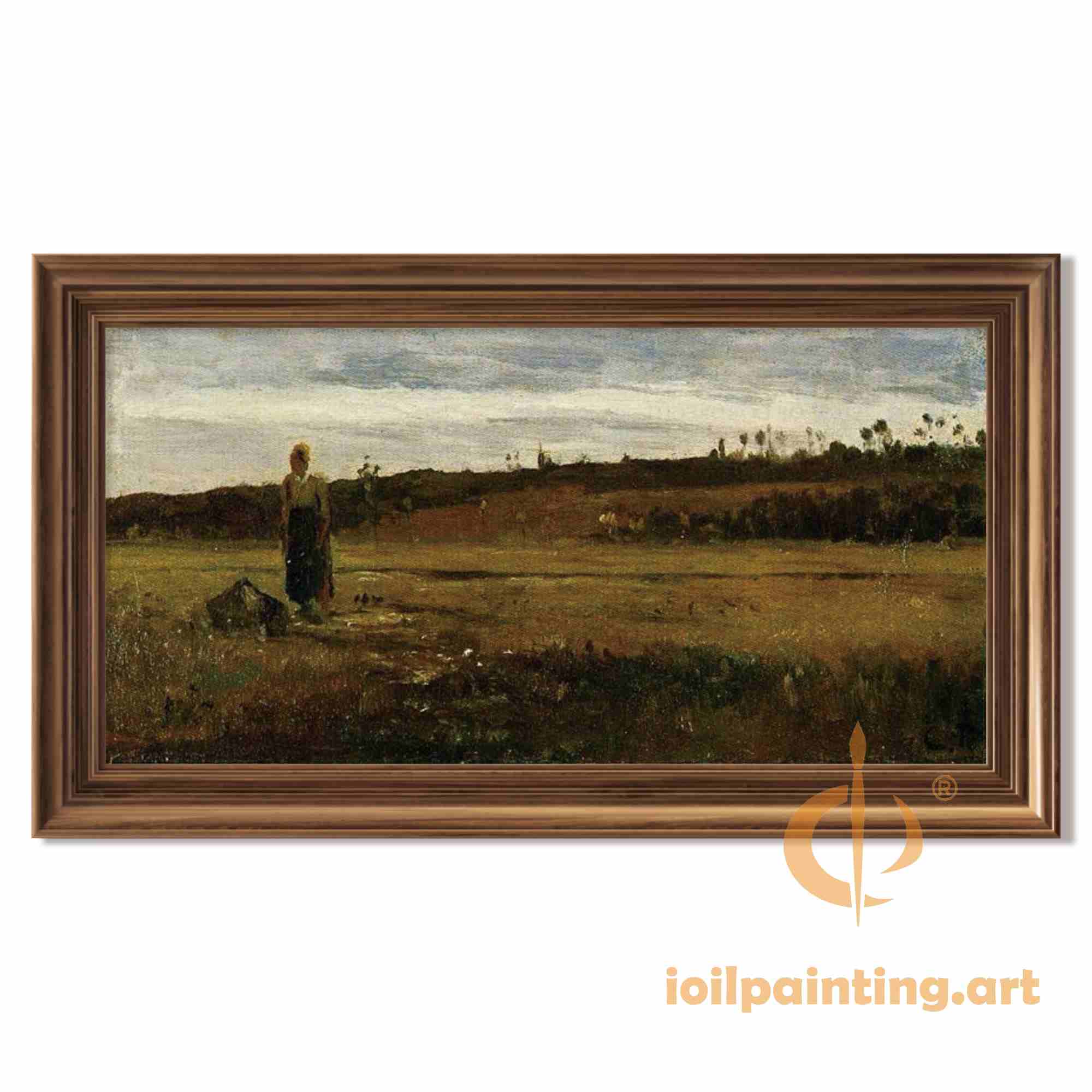 Immerse yourself in the tranquil beauty of rural France with this exquisite hand-painted reproduction of a Camille Pissarro masterpiece. This breathtaking artwork captures a quiet moment of countryside solitude, where a lone figure stands contemplatively amidst vast golden fields that stretch toward gently rolling hills. The warm earth tones of the landscape - rich ochres, soft umbers, and golden yellows - create a harmonious palette that perfectly embodies Pissarro's genius for transforming simple rural scenes into poetic celebrations of light and land.
