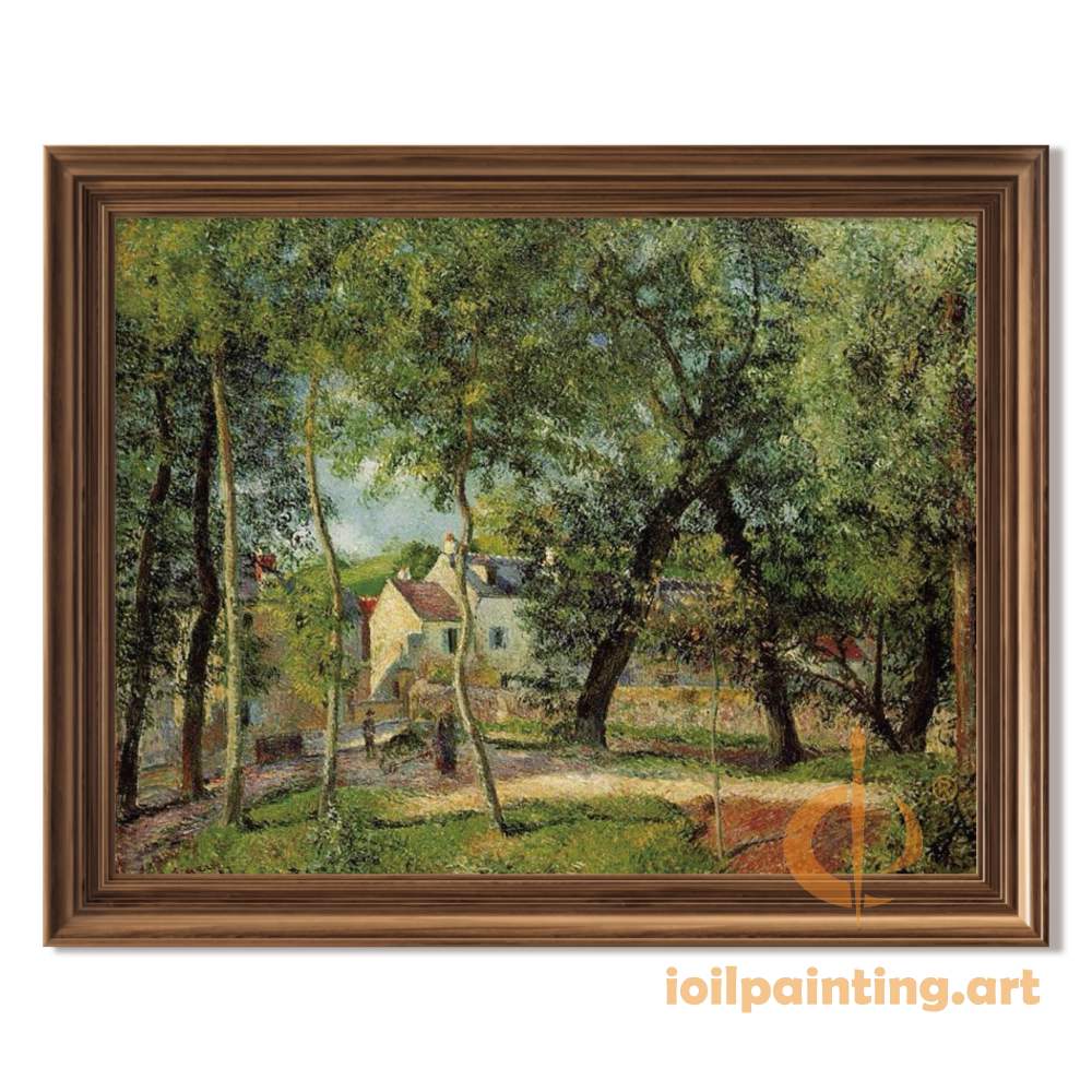 Step into the golden glow of rural France with this exquisite hand-painted reproduction of a Camille Pissarro masterpiece. This breathtaking artwork transports you to a peaceful country lane where dappled sunlight filters through lush green trees, casting delicate patterns on the winding path below. Charming cottages with warm red roofs peek through the verdant foliage, their rustic simplicity perfectly complementing the natural beauty of the landscape - a testament to Pissarro's genius for capturing the quiet poetry of village life.