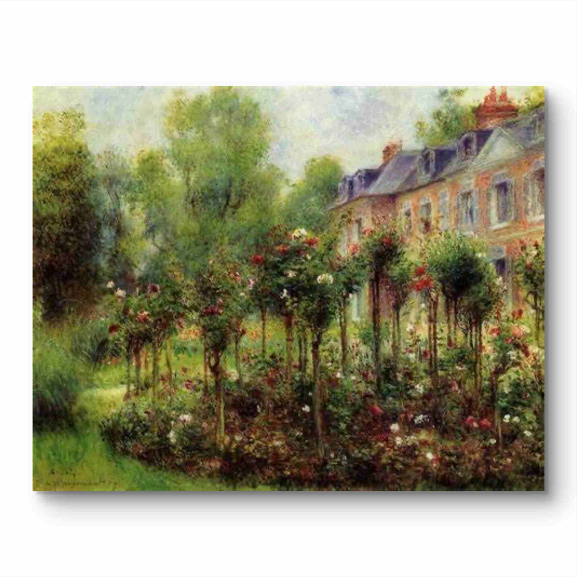Step into a timeless impressionist garden with this exquisite hand-painted reproduction inspired by Claude Monet's floral masterpieces. This breathtaking artwork captures a serene garden scene where vibrant red and delicate white roses bloom in perfect harmony, their petals catching the sunlight before a charming rustic building with weathered walls and a sloping roof.