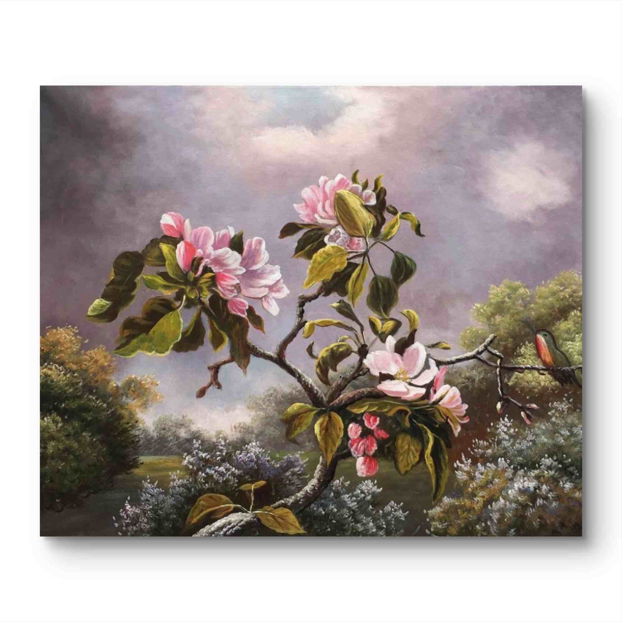 Celebrate the delicate beauty of spring with this exquisite hand-painted reproduction inspired by Claude Monet's floral masterpieces. This breathtaking artwork captures a graceful branch adorned with clusters of soft pink blossoms, their petals rendered in delicate brushstrokes that appear to tremble in an imaginary breeze. Set against a dreamy, impressionistic background of muted greens and blues, this composition radiates tranquility and natural elegance.