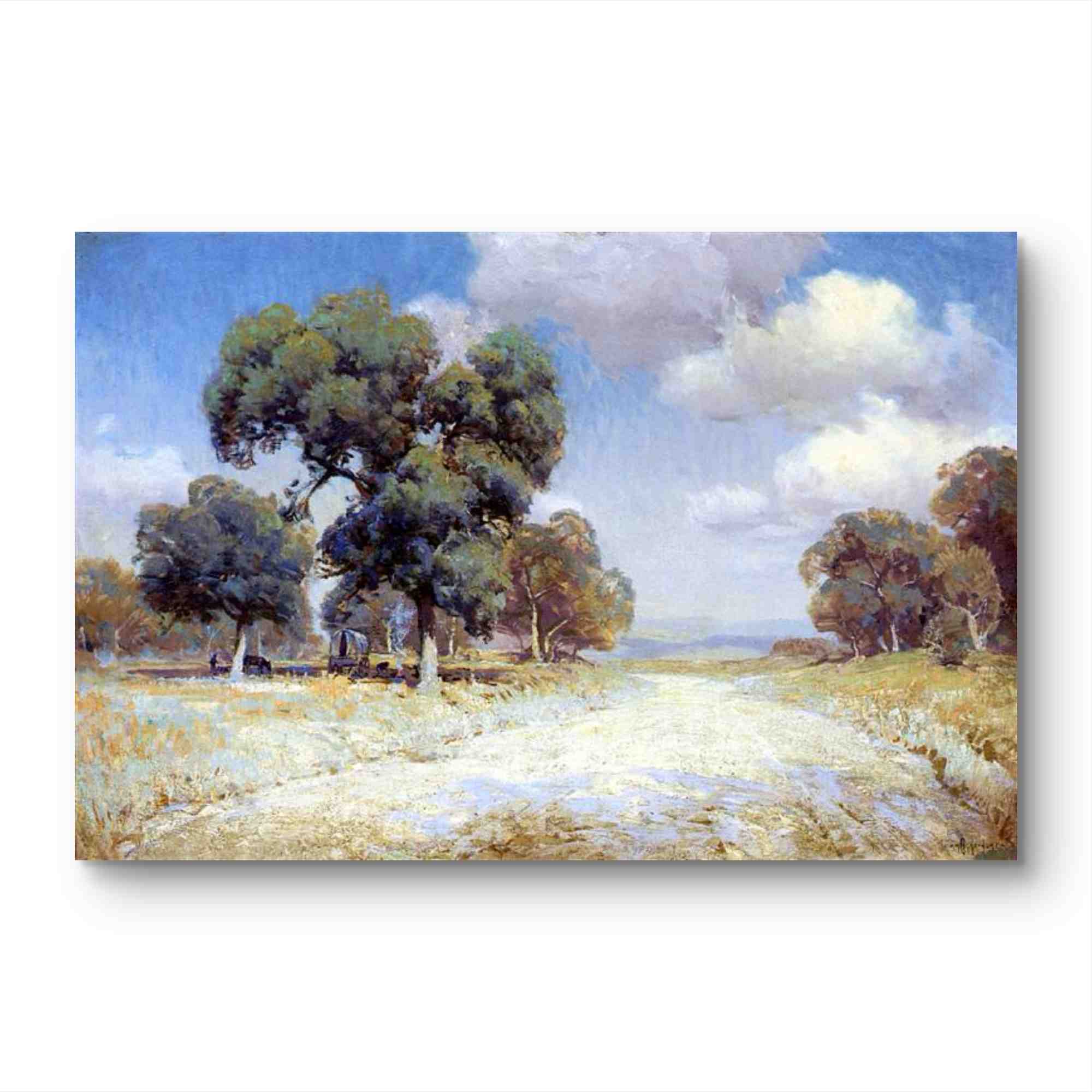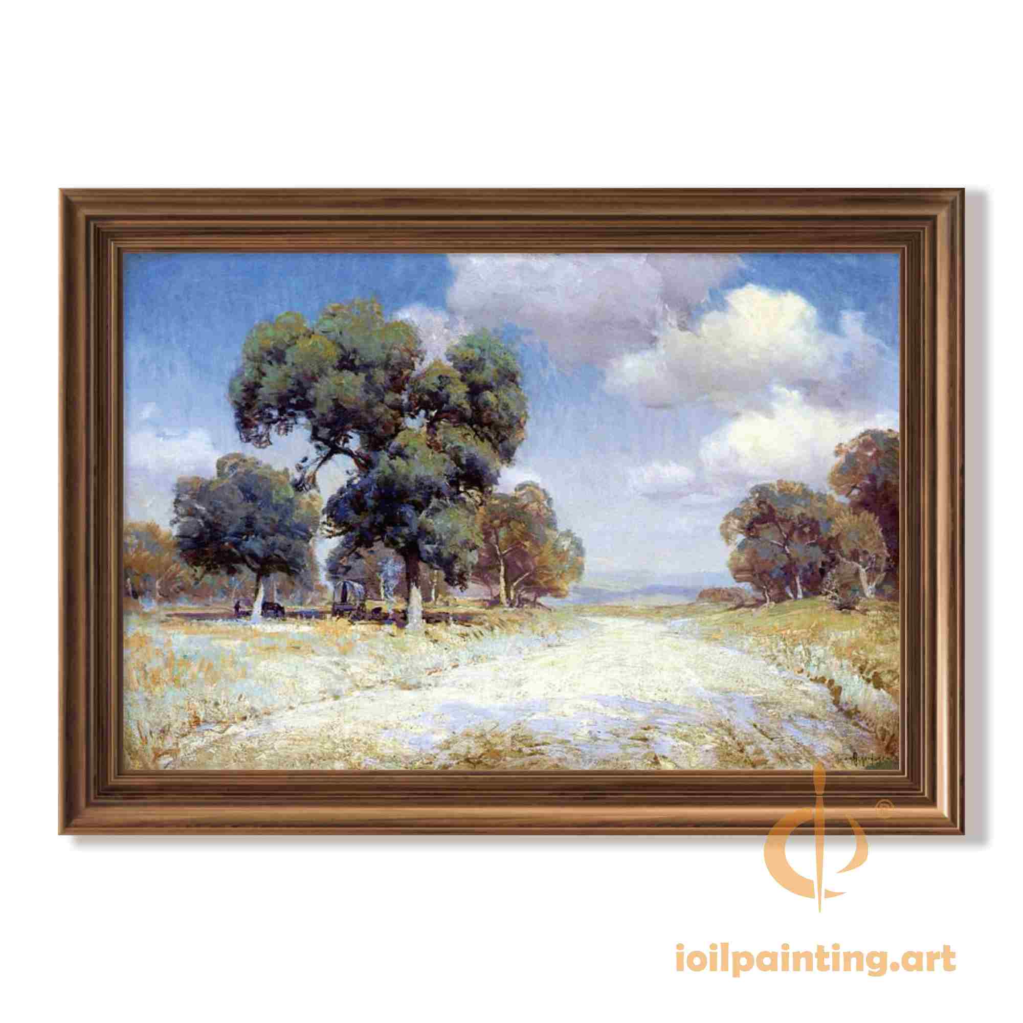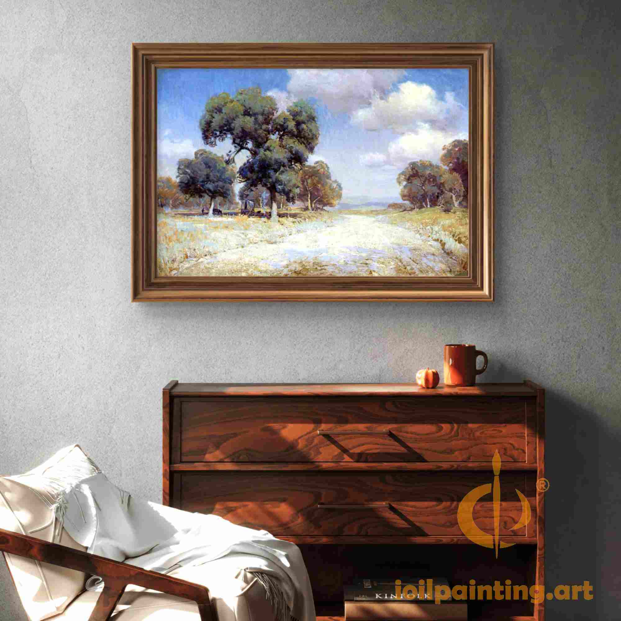 Step into a timeless pastoral idyll with this meticulously hand-painted reproduction of a 19th-century European landscape masterpiece. Picture yourself walking down a sun-dappled country road flanked by towering trees—their lush canopies woven from emerald and sage brushstrokes—while a horse-drawn carriage rests beneath the whispering foliage. In the distance, soft mountain silhouettes melt into skies painted with celestial clouds, creating a symphony of tranquility in oil.