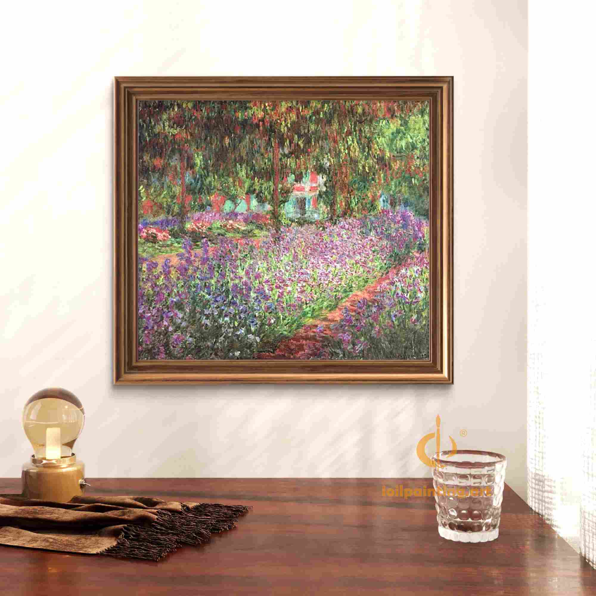 Step into Claude Monet's enchanting world with this exquisite hand-painted reproduction of his beloved garden scene at Giverny. This breathtaking artwork captures the essence of French Impressionism, where vibrant purple blooms dance along a winding path, framed by graceful willow trees swaying in the breeze.
