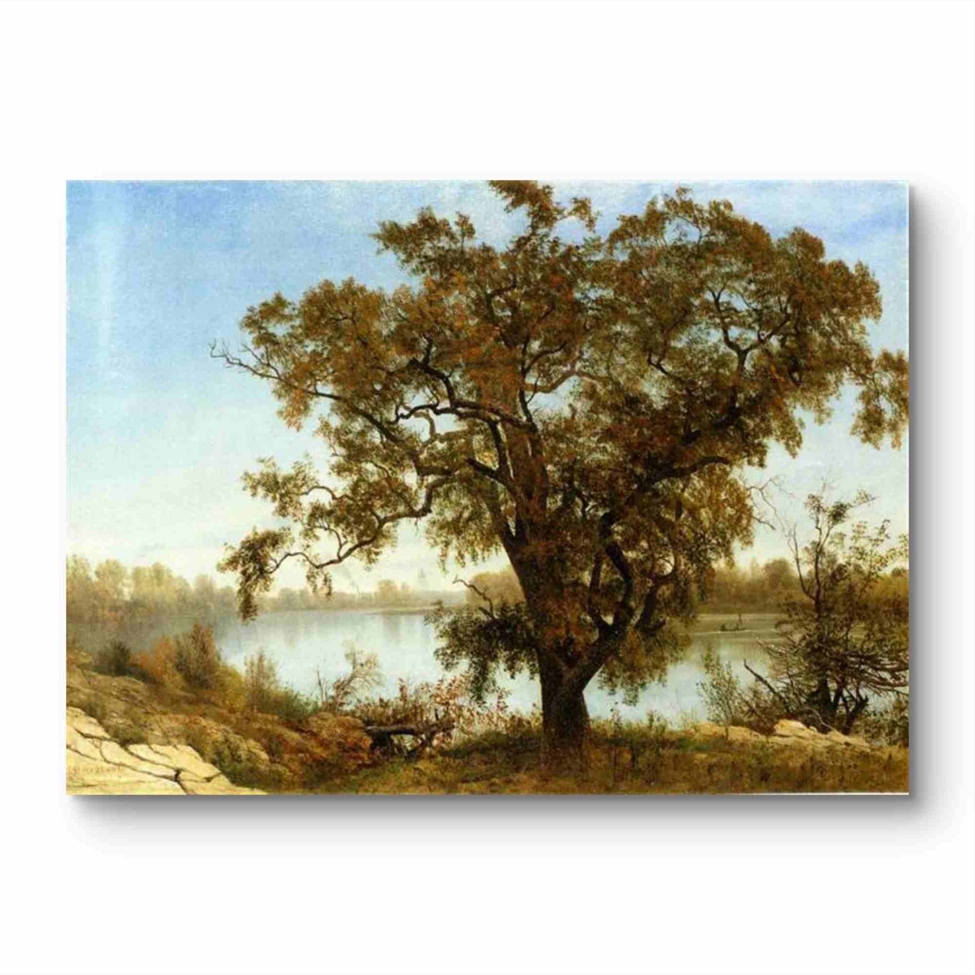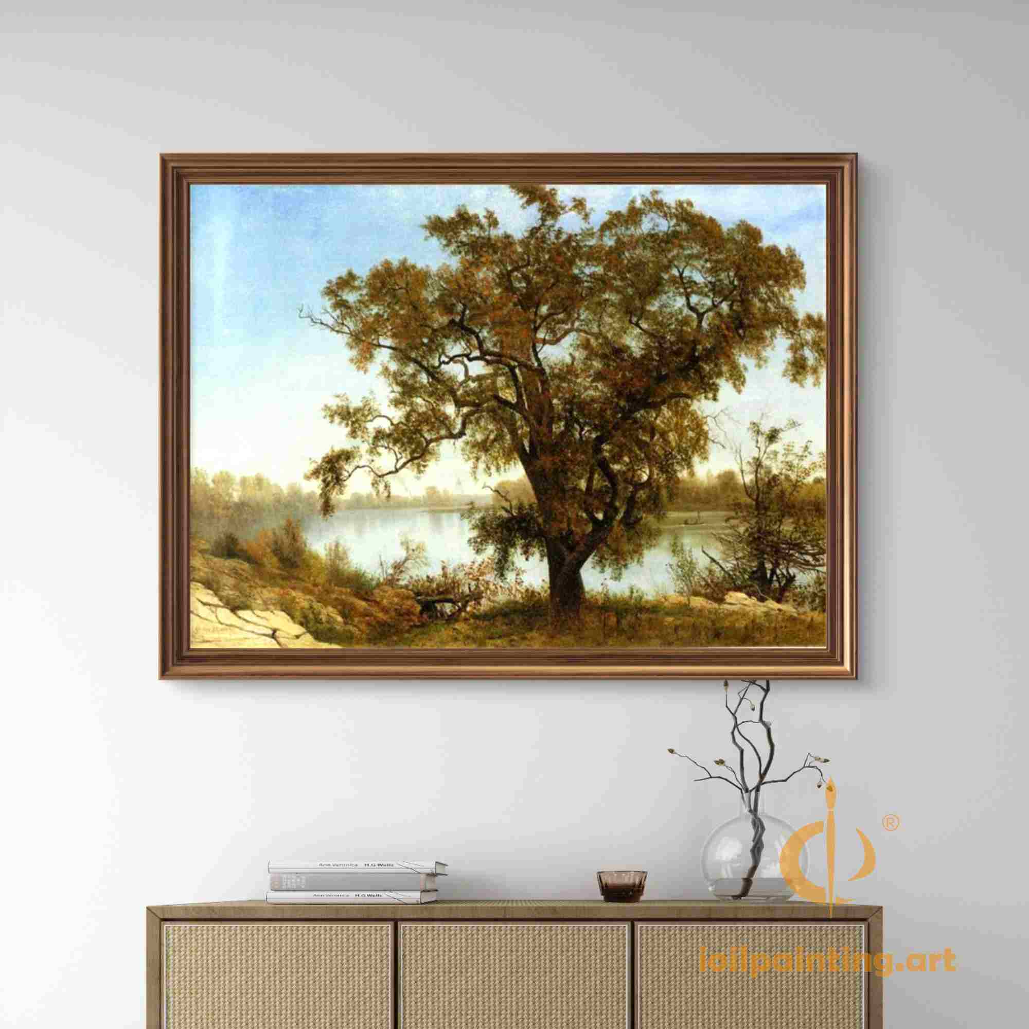 • The majestic tree's textured bark and sprawling branches demonstrate masterful impasto technique