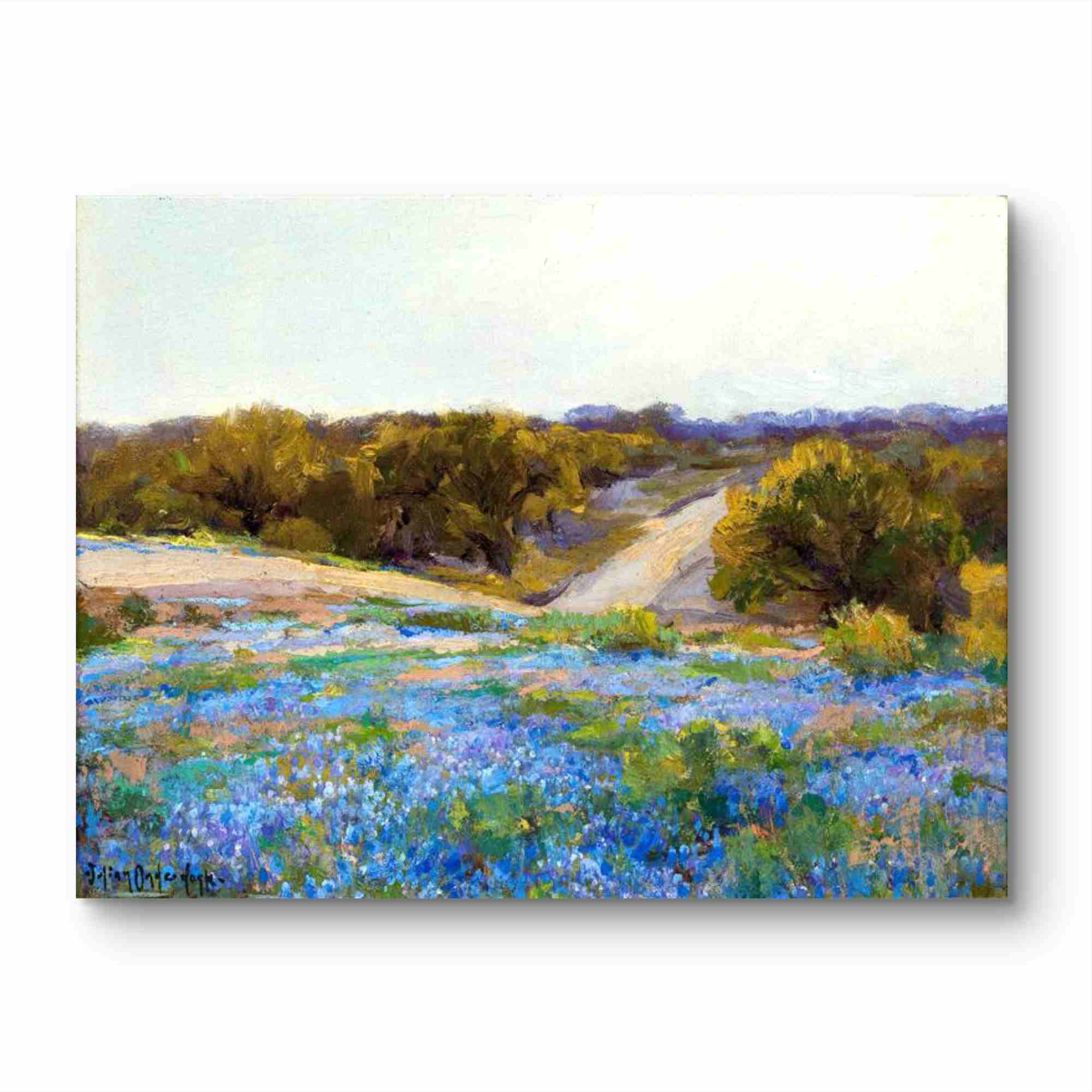 Immerse yourself in the breathtaking beauty of nature with this exquisite hand-painted reproduction of a classic landscape. This stunning artwork transports you to a serene countryside where a winding dirt path invites you to wander through a vibrant sea of blue-purple wildflowers, their delicate petals swaying gently in the breeze. Towering trees with lush green and golden foliage frame the scene, creating a perfect harmony of colors that dance beneath a soft, dreamy sky.
