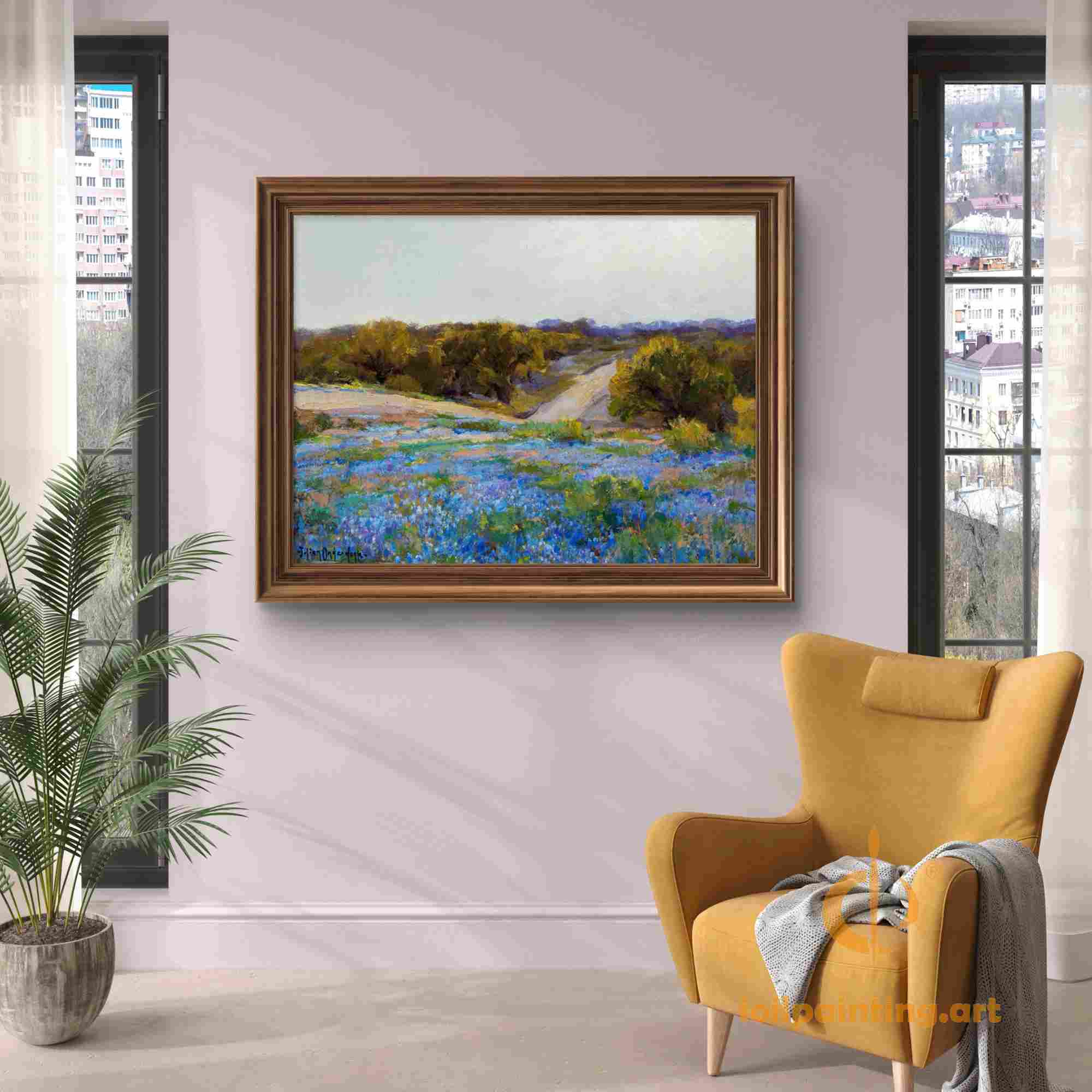 More than decor—this is a portal to pastoral tranquility. The composition's perfect balance between vibrant foreground and atmospheric background creates a living artwork that transforms with your lighting. Notice how morning light intensifies the floral blues while evening illumination warms the golden foliage.