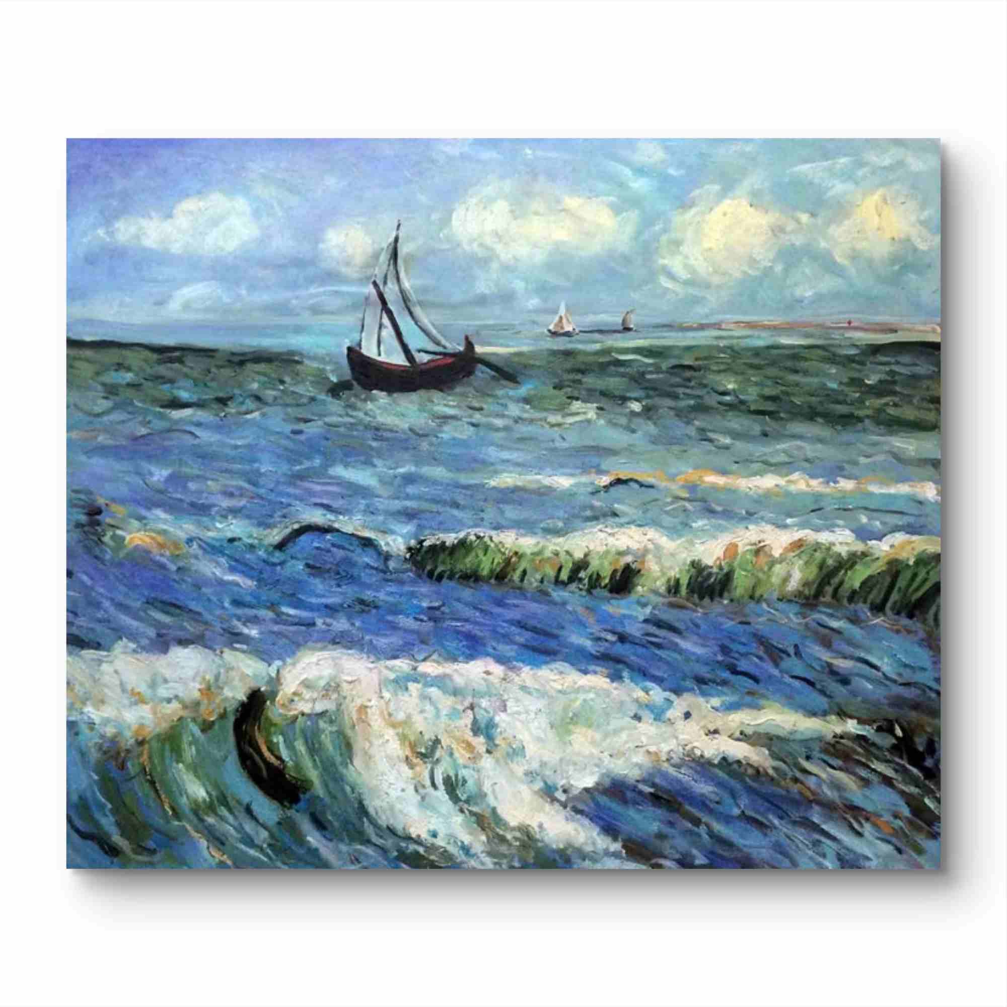 Immerse yourself in the breathtaking beauty of Claude Monet's impressionist seascape with this exquisite hand-painted reproduction. This captivating artwork transports you to a serene maritime moment, where a majestic sailboat with rich crimson hull and billowing white sails glides across shimmering turquoise waters, accompanied by smaller vessels dotting the horizon.