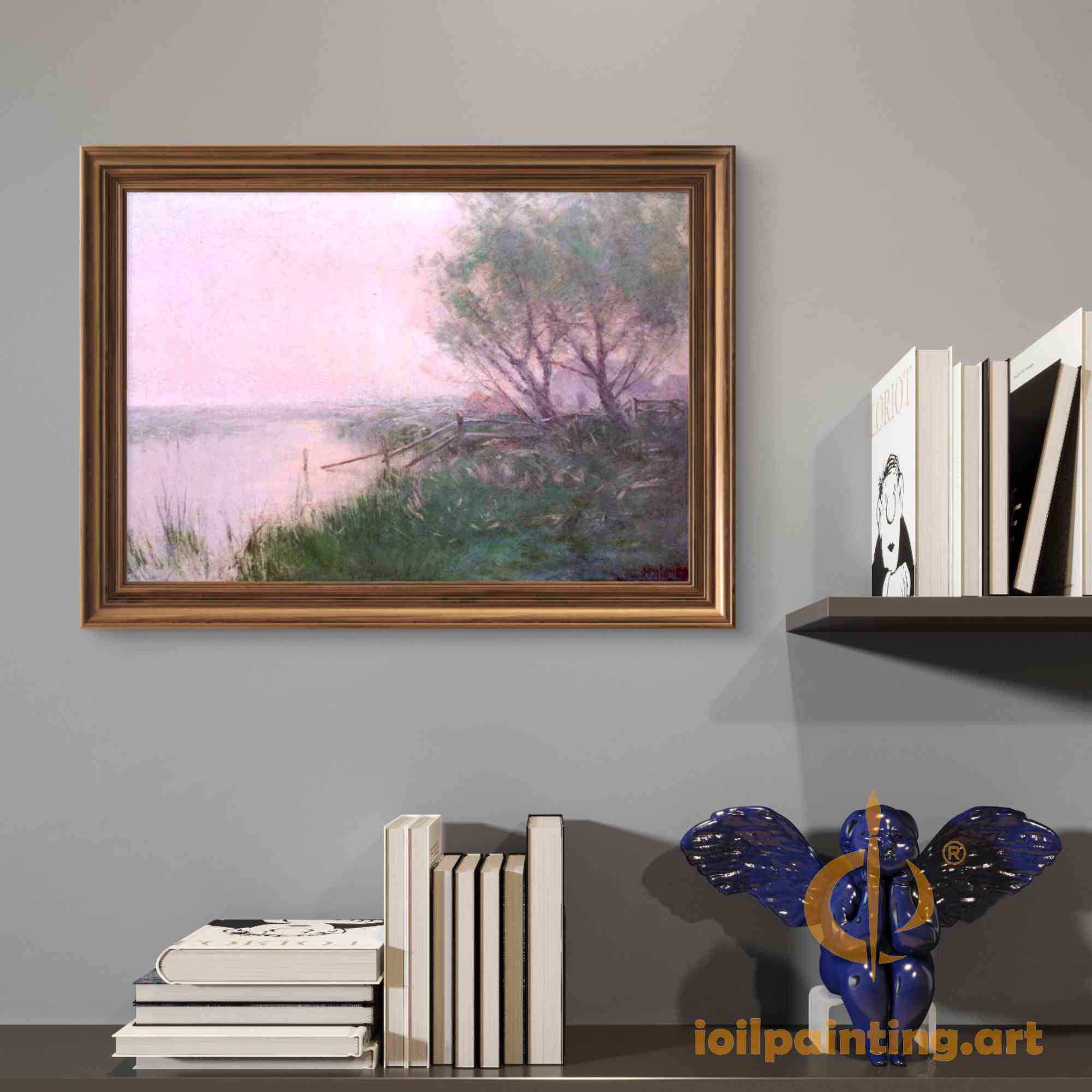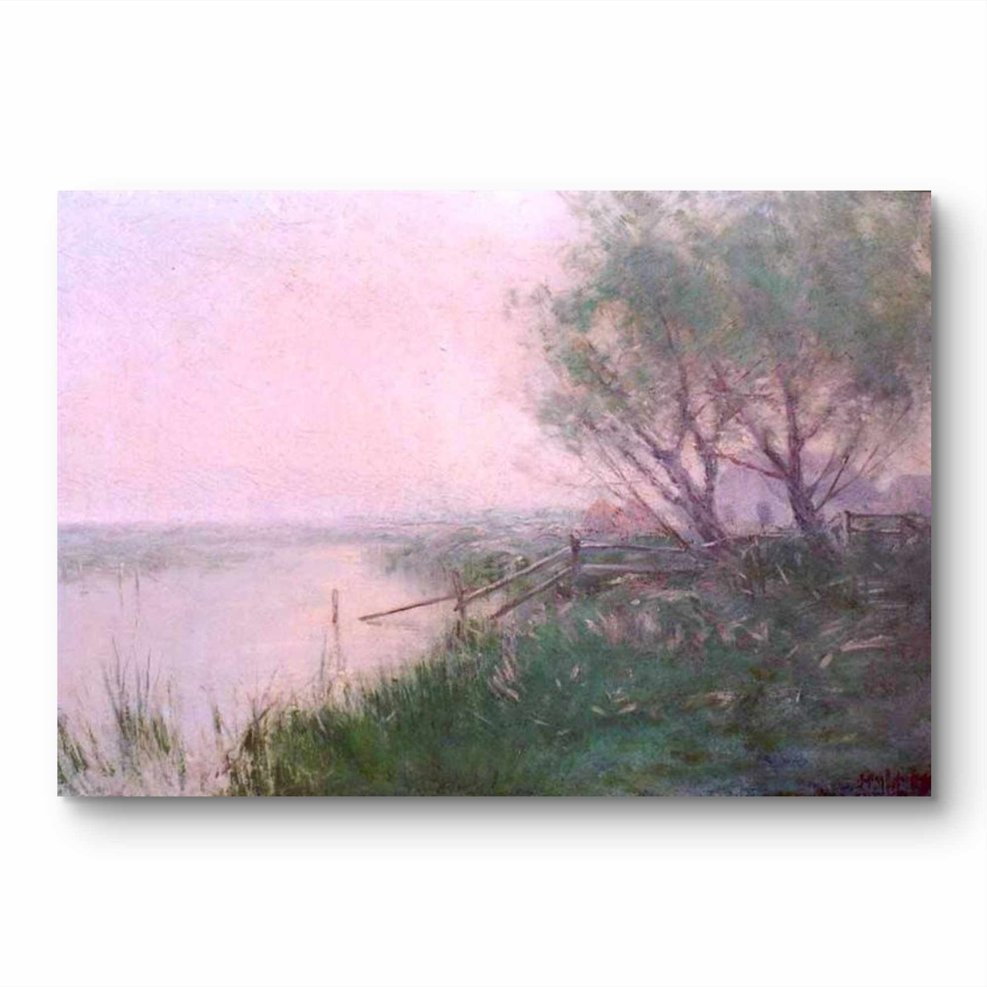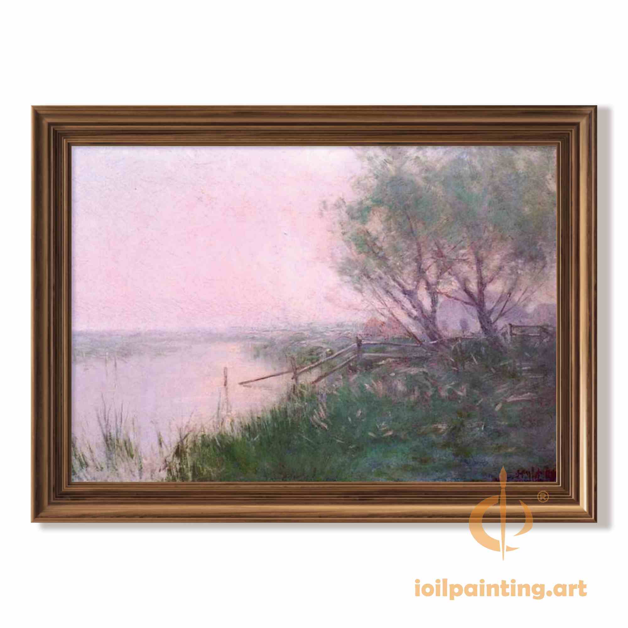 Immerse yourself in the tranquil beauty of Impressionist art with this exquisite hand-painted reproduction of a riverside landscape reminiscent of Julian Onderdonk's style. This breathtaking artwork captures nature's peaceful harmony - lush green trees with delicate blossoms arch gracefully over a wooden fence, their reflections shimmering in calm waters that merge seamlessly with soft pink-tinged skies at dusk.