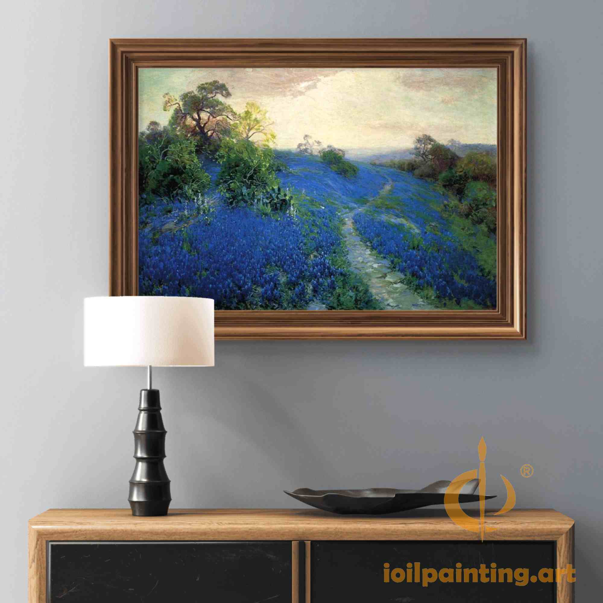 Step into the breathtaking beauty of the Texas Hill Country with this exquisite hand-painted reproduction of Julian Onderdonk's iconic bluebonnet landscape. This masterpiece captures nature's most spectacular spring display - a vast sea of cobalt blue wildflowers stretches toward the horizon, their vibrant petals swaying along a winding dirt path that invites you to wander through this floral paradise. Towering oak trees with golden-green foliage frame the scene, their branches casting delicate shadows across the blooms.