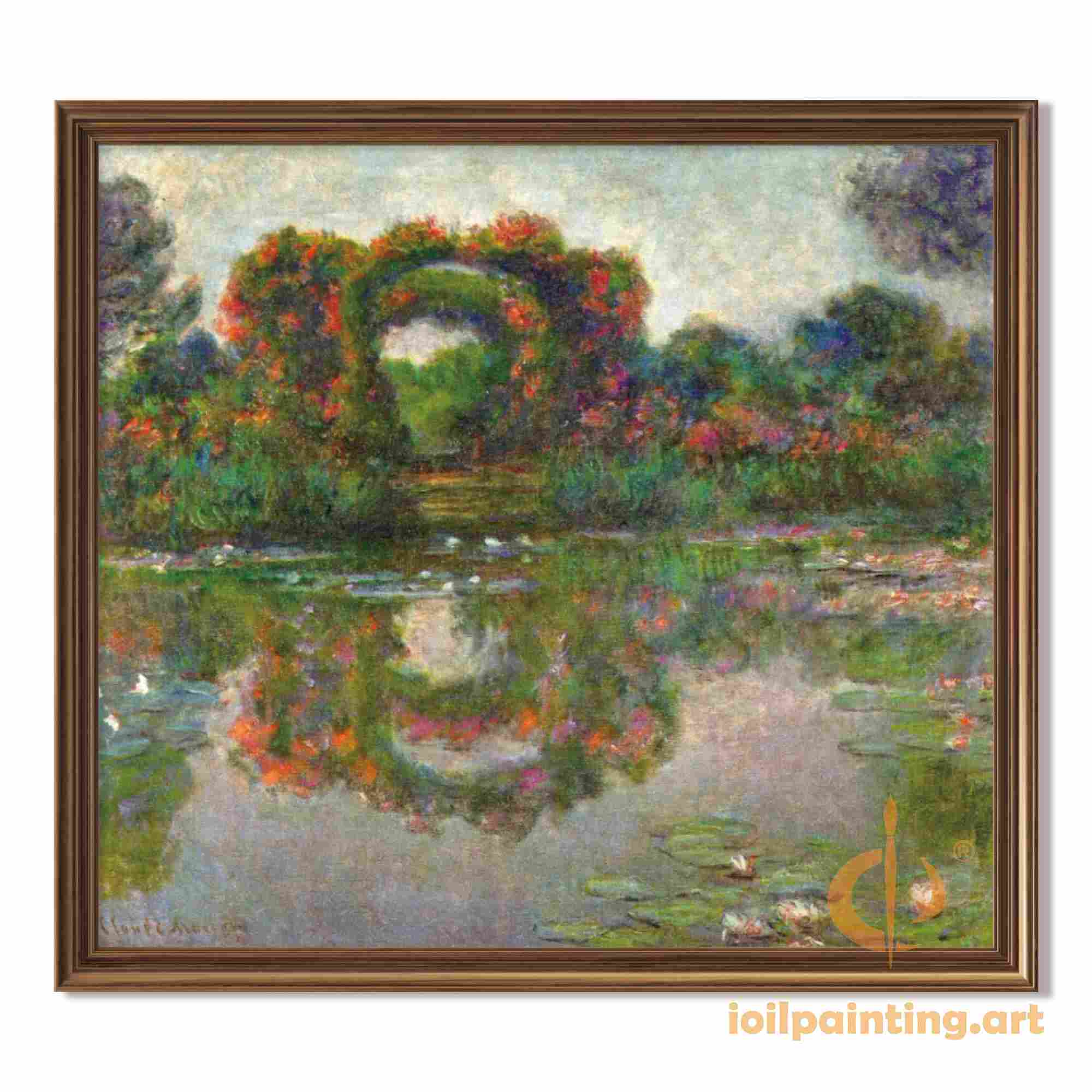 Immerse yourself in the dreamy beauty of Claude Monet's legendary water garden with this exquisite hand-painted reproduction. This breathtaking artwork transports you to the heart of Monet's Giverny paradise, where a graceful Japanese bridge draped in vibrant roses arches elegantly over the iconic water-lily pond. The lush greenery of surrounding foliage reflects perfectly in the calm waters, dotted with delicate lily pads and blossoms in full bloom.