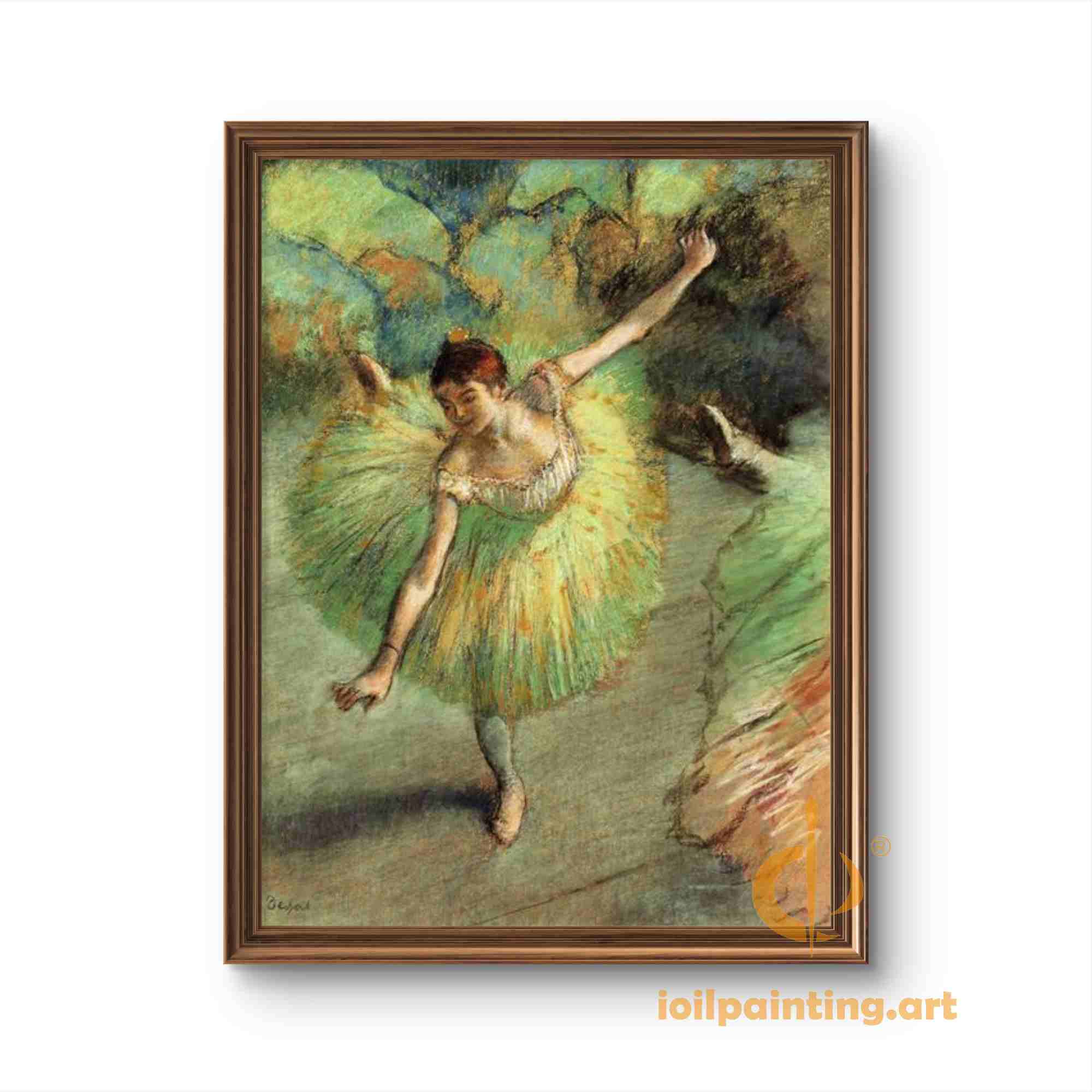 Step into the magical world of Parisian ballet with this exquisite hand-painted reproduction of Edgar Degas' masterpiece. This breathtaking artwork captures the ethereal beauty of a ballerina mid-pose, her delicate green tutu floating around her as she balances effortlessly on one foot. The dancer's poised expression and graceful arm extension reveal Degas' profound understanding of movement and feminine elegance, while the soft, muted background makes her vibrant costume shine like an emerald jewel.