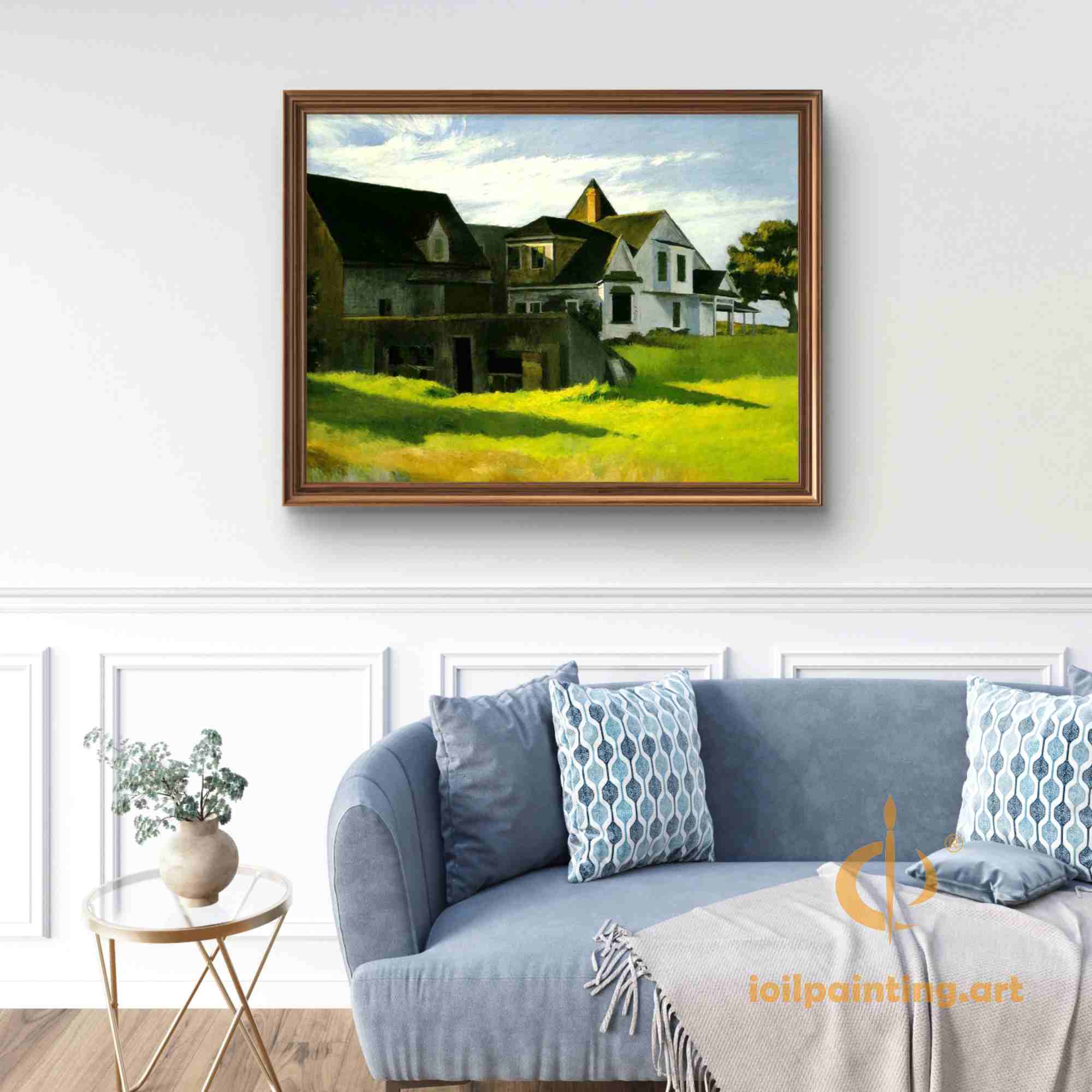 Immerse yourself in the peaceful simplicity of rural America with this exquisite hand-painted reproduction of Edward Hopper's masterpiece. This breathtaking artwork transports you to a serene countryside scene where charming houses stand proudly amidst lush green grass, their weathered facades telling stories of quiet country living. The warm sunlight bathes the scene in golden hues, casting soft shadows that highlight Hopper's masterful play with light and form.