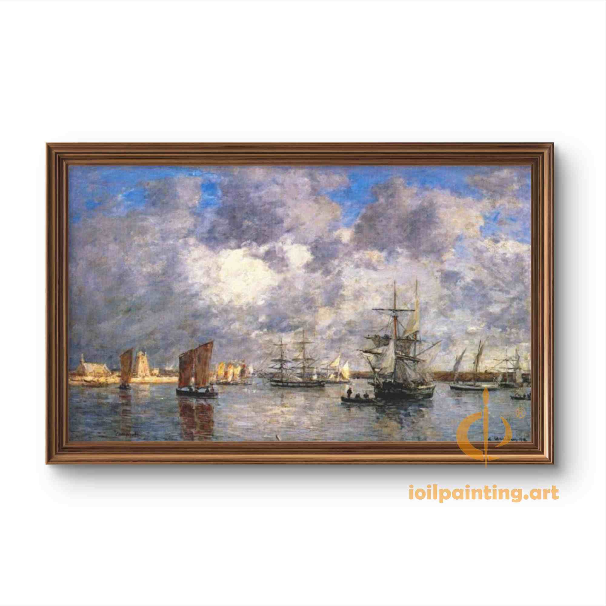 Immerse yourself in the vibrant energy of a 19th-century French harbor with this exquisite hand-painted reproduction of Eugène Boudin's masterpiece. This breathtaking artwork transports you to a lively coastal scene where majestic sailing ships and smaller boats create a picturesque maritime tableau. The soft, billowing clouds in the expansive sky perfectly frame the bustling harbor activity below, showcasing Boudin's extraordinary ability to capture both the movement of ships and the tranquil beauty of coastal life.