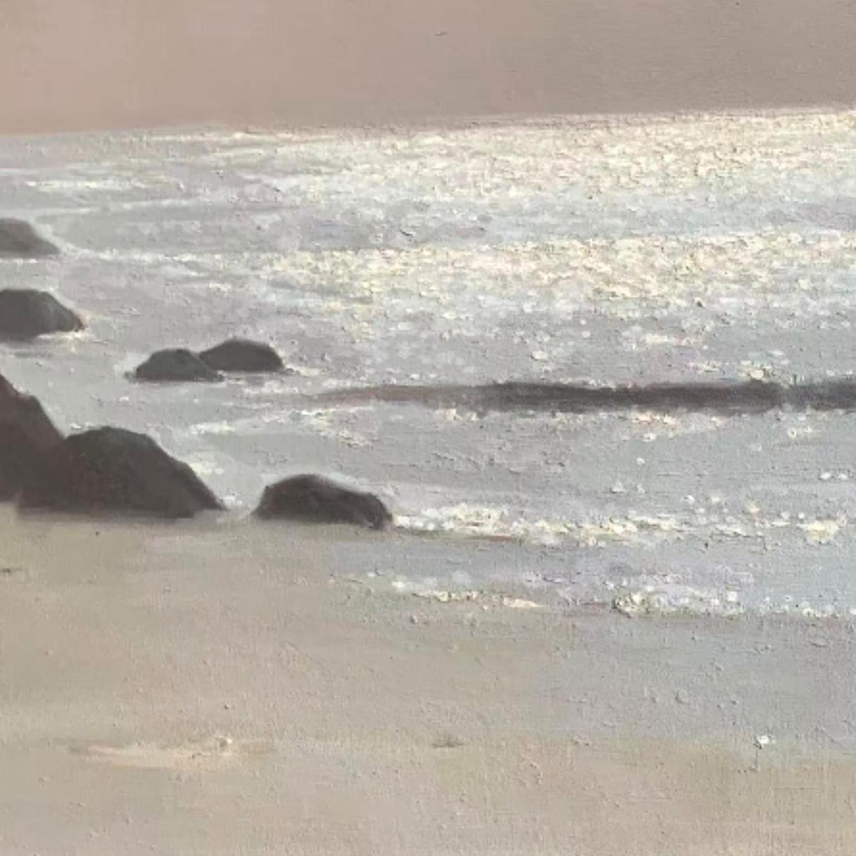 Bask in the warm glow of coastal tranquility with this exquisite hand-painted reproduction capturing the magic of seaside golden hour. The artwork masterfully depicts a serene beach scene where shimmering turquoise waters gently kiss golden sands, while dramatic rock formations add striking contrast to the soft, flowing composition.