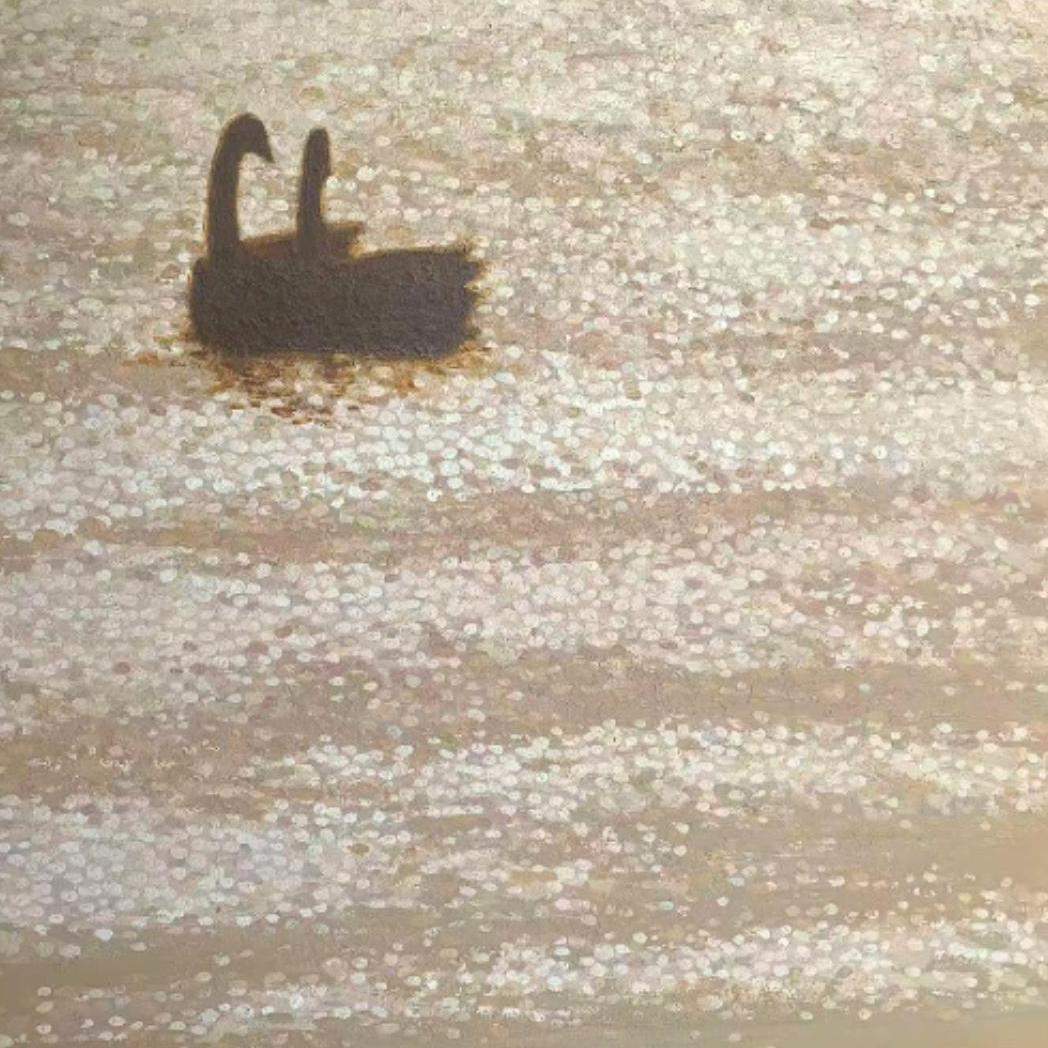 • The striking contrast between the swans' graceful forms and the warm, earthy tones of the lake