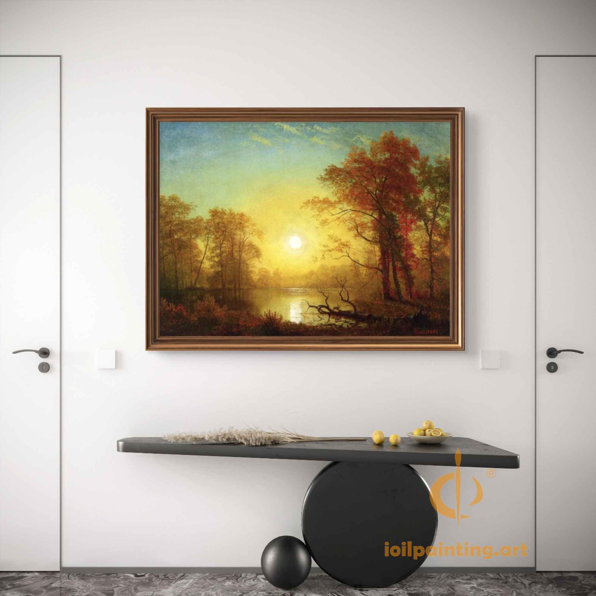 Immerse yourself in the golden tranquility of nature with this exquisite hand-painted reproduction of a John Constable-inspired landscape. This breathtaking artwork captures the perfect harmony of autumn, where towering trees dressed in fiery foliage stand guard over a mirror-like lake, their vibrant reflections dancing in the warm glow of the setting sun.