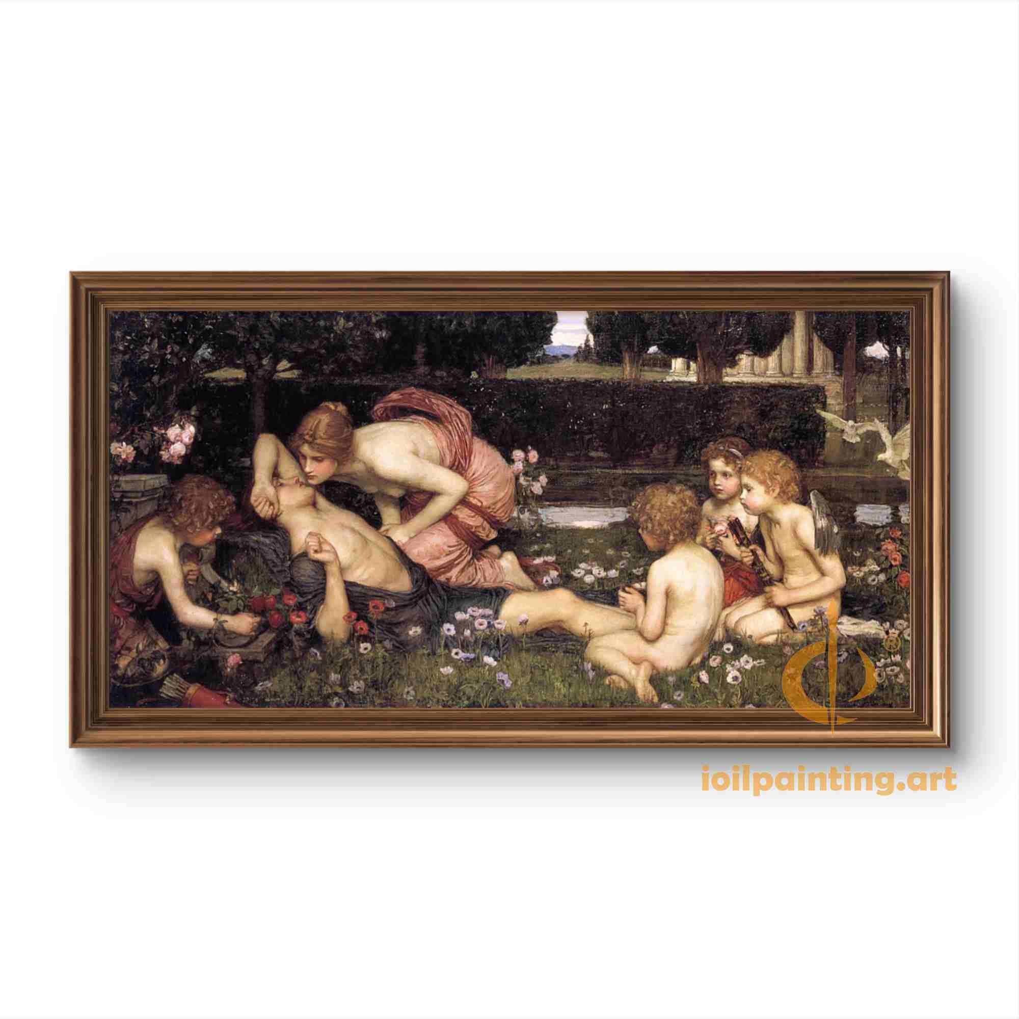 Step into a timeless moment of love and innocence with this exquisite hand-painted reproduction of John William Waterhouse's masterpiece. This breathtaking artwork transports you to a sunlit garden where a tender scene unfolds - a graceful woman leans down to bestow a gentle kiss upon a reclining man, while playful children surround them with flowers and musical instruments. The lush greenery of the garden, complete with towering trees and distant architecture, creates a dreamlike setting that perfectly embodies Waterhouse's Pre-Raphaelite vision of romantic beauty.