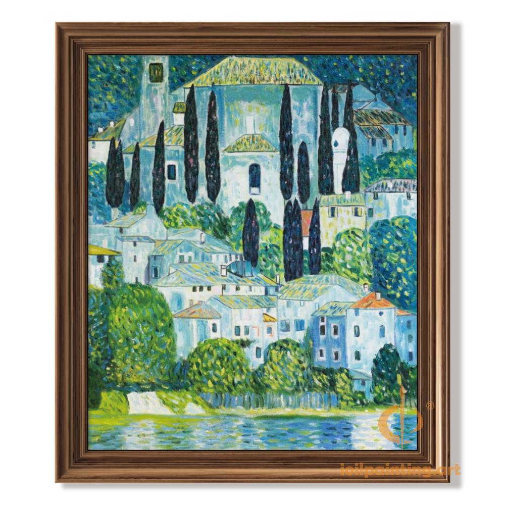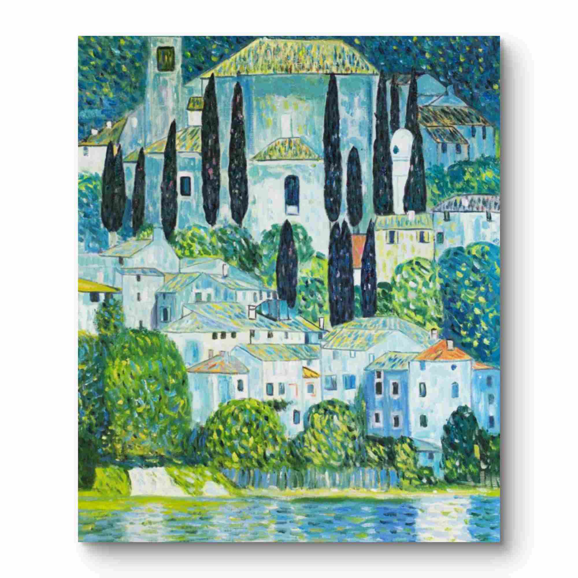 Transport yourself to the sun-drenched coasts of the Mediterranean with this exquisite hand-painted reproduction of a charming coastal village scene. This breathtaking artwork captures the timeless beauty of whitewashed houses with terracotta roofs nestled among lush greenery, where towering cypress trees stand as sentinels against the azure sky.
