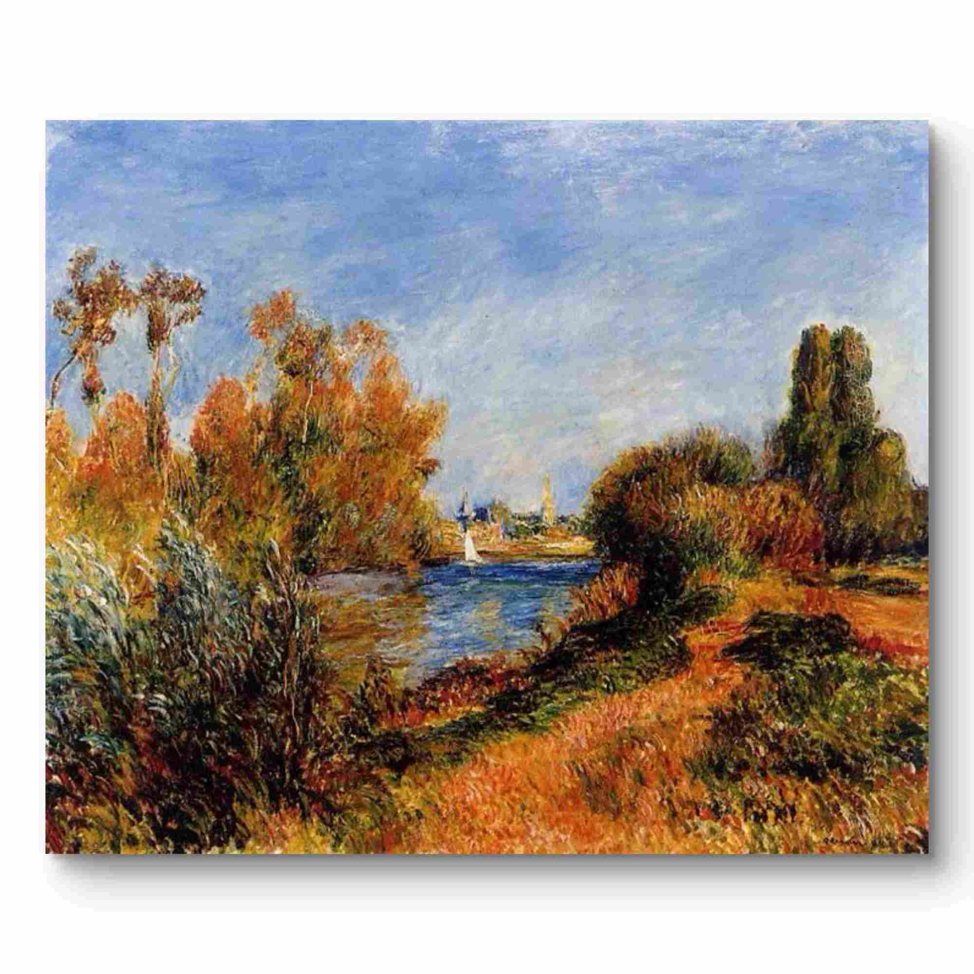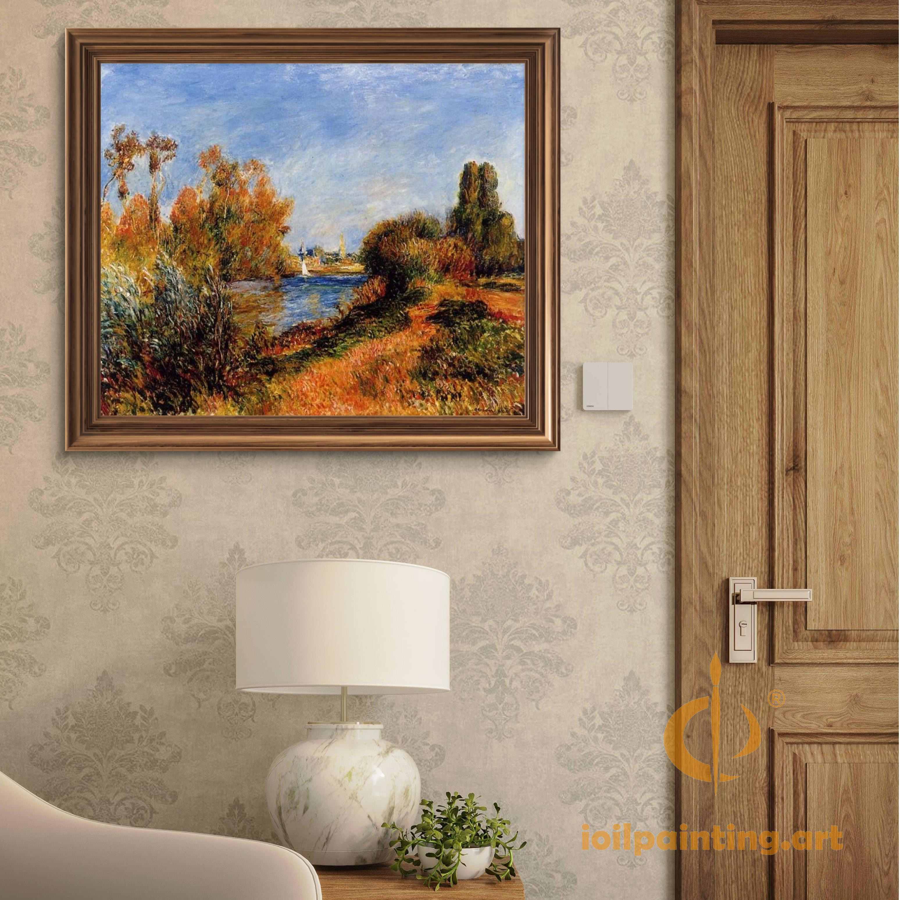 Immerse yourself in the golden warmth of autumn with this exquisite hand-painted reproduction of Pierre-Auguste Renoir's Autumn River Landscape. This breathtaking artwork captures a serene river winding through a countryside ablaze with fall colors, where trees adorned in golden and crimson foliage reflect in the shimmering waters, and distant church spires peek through the soft, atmospheric sky.