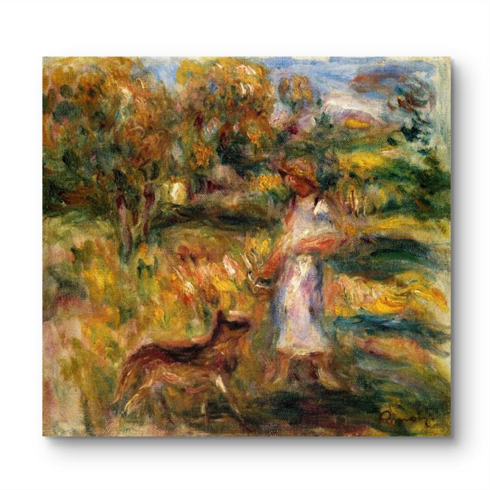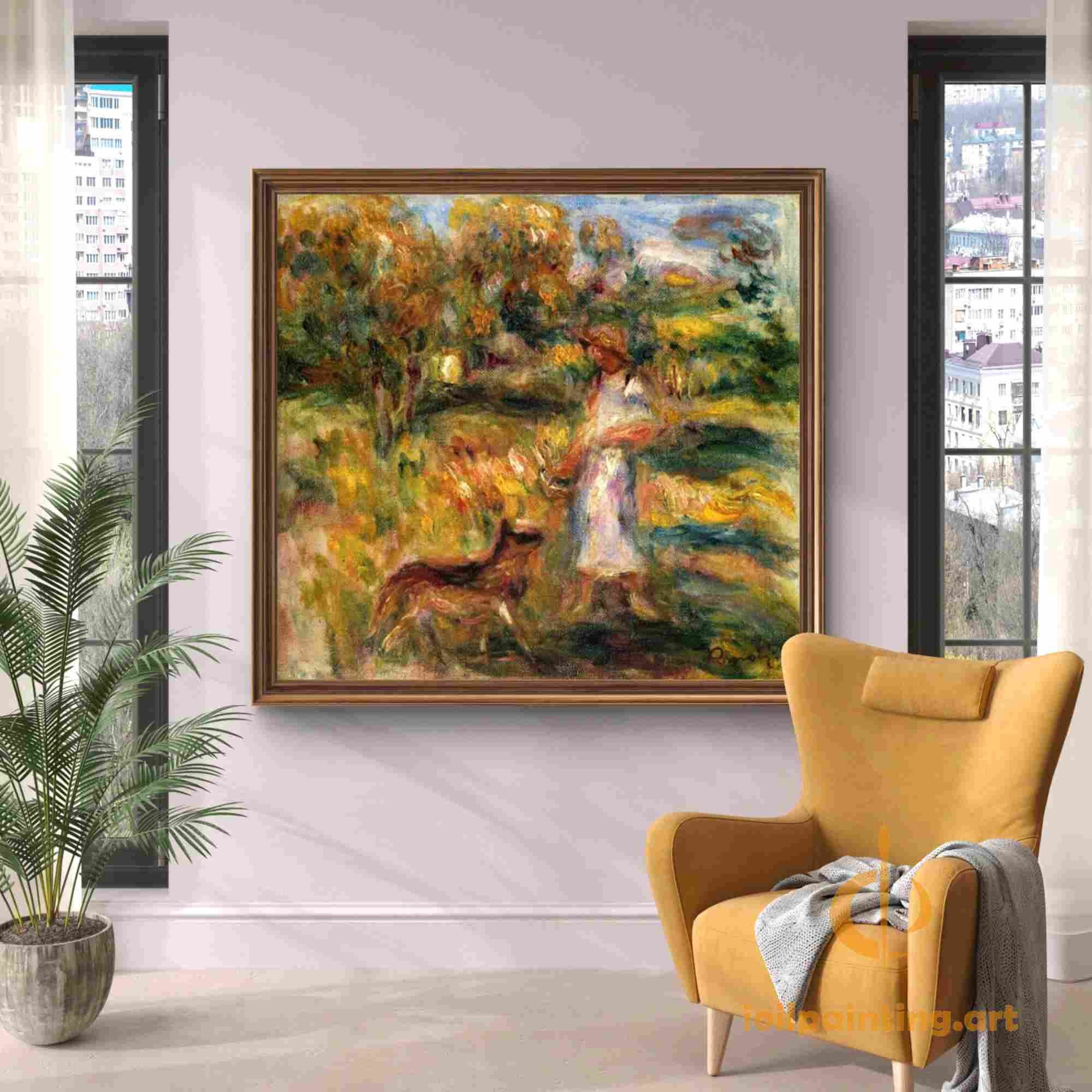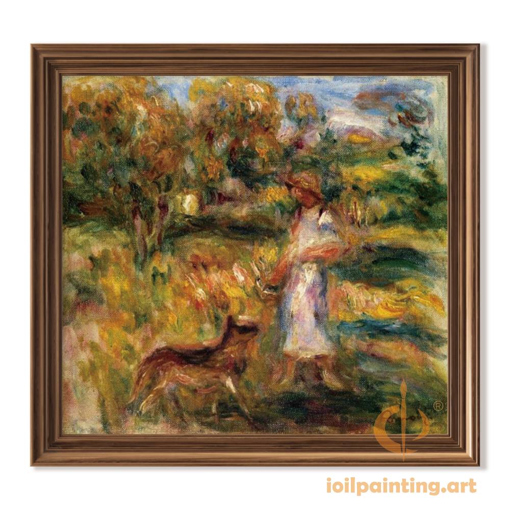 Experience the timeless charm of French Impressionism with this exquisite hand-painted reproduction of Pierre-Auguste Renoir's heartwarming garden scene. This captivating artwork portrays an elegant woman in a flowing pastel dress and fashionable hat, gently caressing her loyal brown companion amidst a sun-dappled paradise of vibrant greenery and colorful blooms.