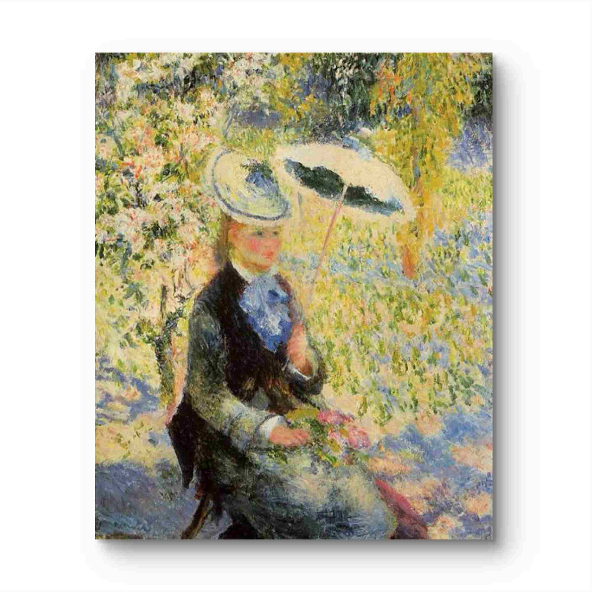 Step into the radiant world of French Impressionism with this exquisite hand-painted reproduction of Pierre-Auguste Renoir's enchanting garden scene. This captivating artwork portrays an elegant woman in a flowing dark dress, her delicate white parasol tilted gracefully as she gathers a bouquet of fresh blooms. The lush garden surrounding her bursts with vibrant flowers and dappled sunlight, showcasing Renoir's masterful ability to capture feminine beauty amidst nature's splendor.