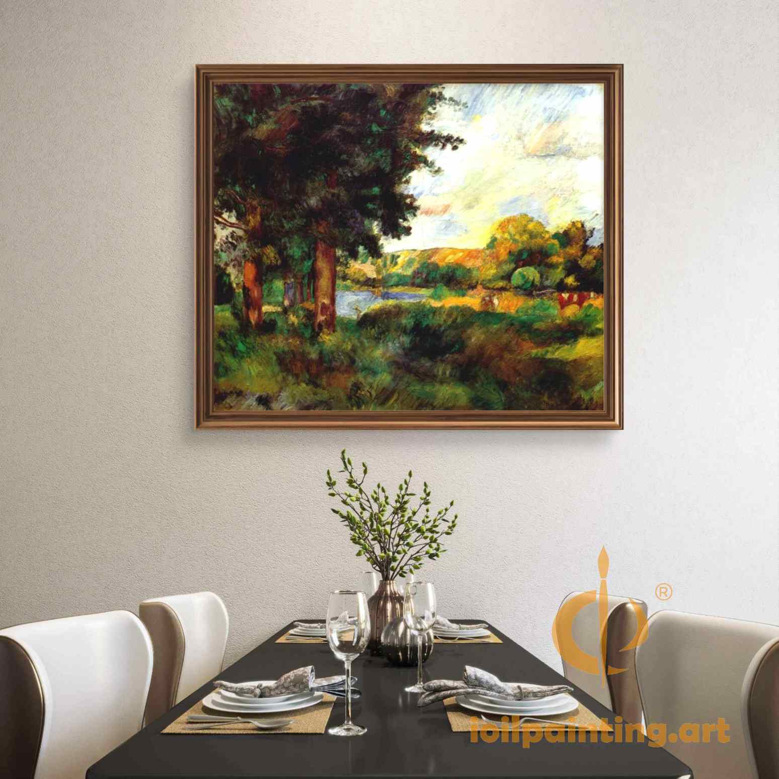 "Pierre-Auguste Renoir's 'Lakeside Tranquility' Oil Painting Reproduction - Serene Landscape with Towering Trees"
