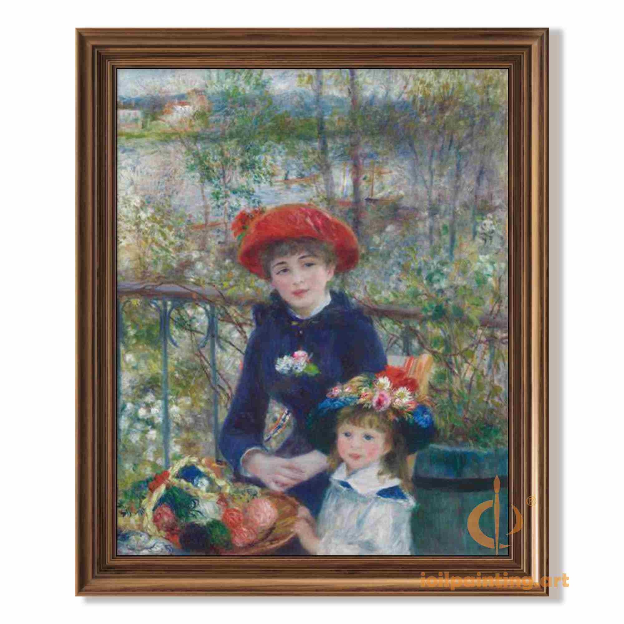 Step into the luminous world of French Impressionism with this exquisite hand-painted reproduction of Camille Corot's heartwarming masterpiece, Mother and Child on the Terrace. This breathtaking artwork captures an intimate moment between an elegantly dressed woman in deep blue with a vibrant red bonnet, and a cherubic child adorned with a floral wreath, seated together on a sun-dappled terrace surrounded by lush greenery.