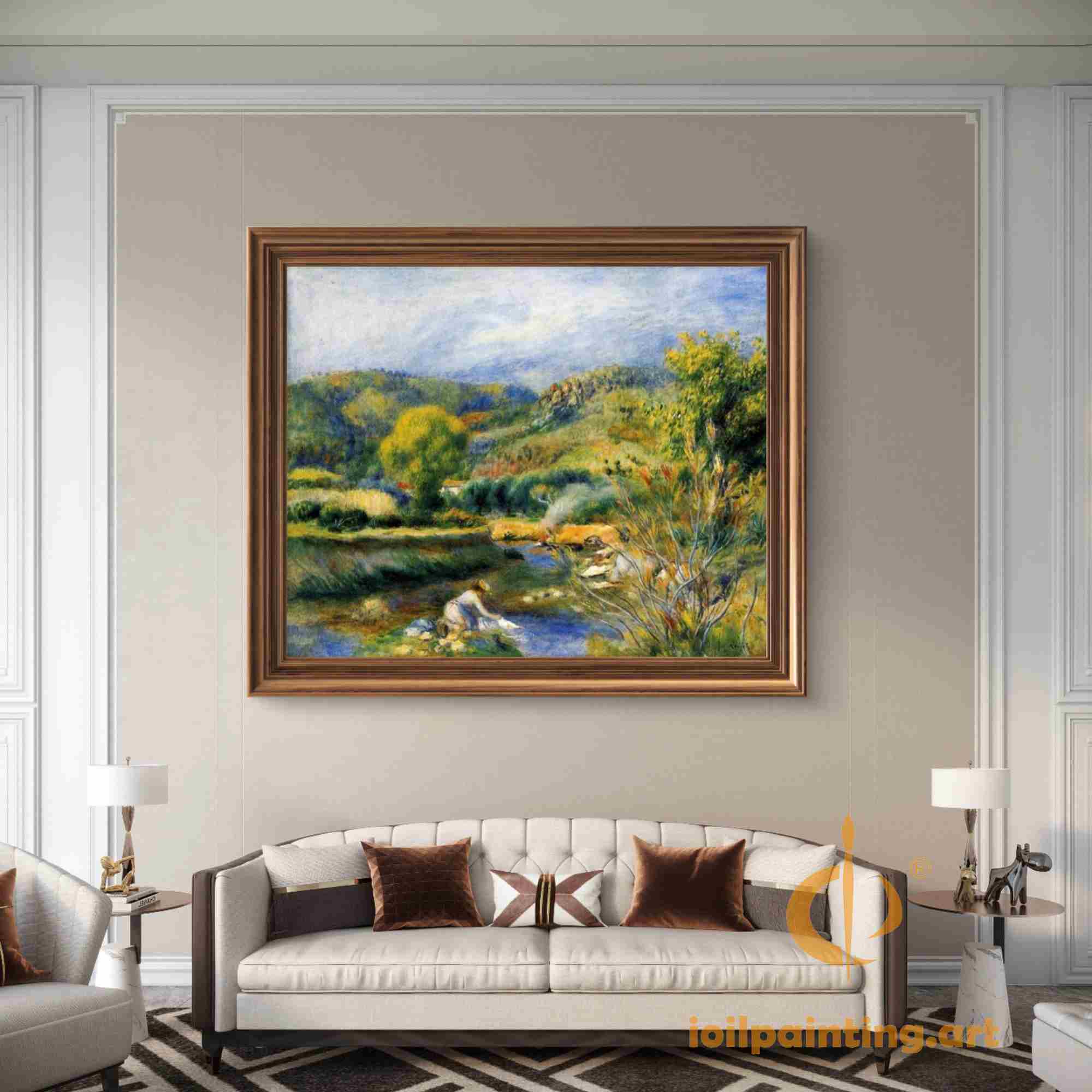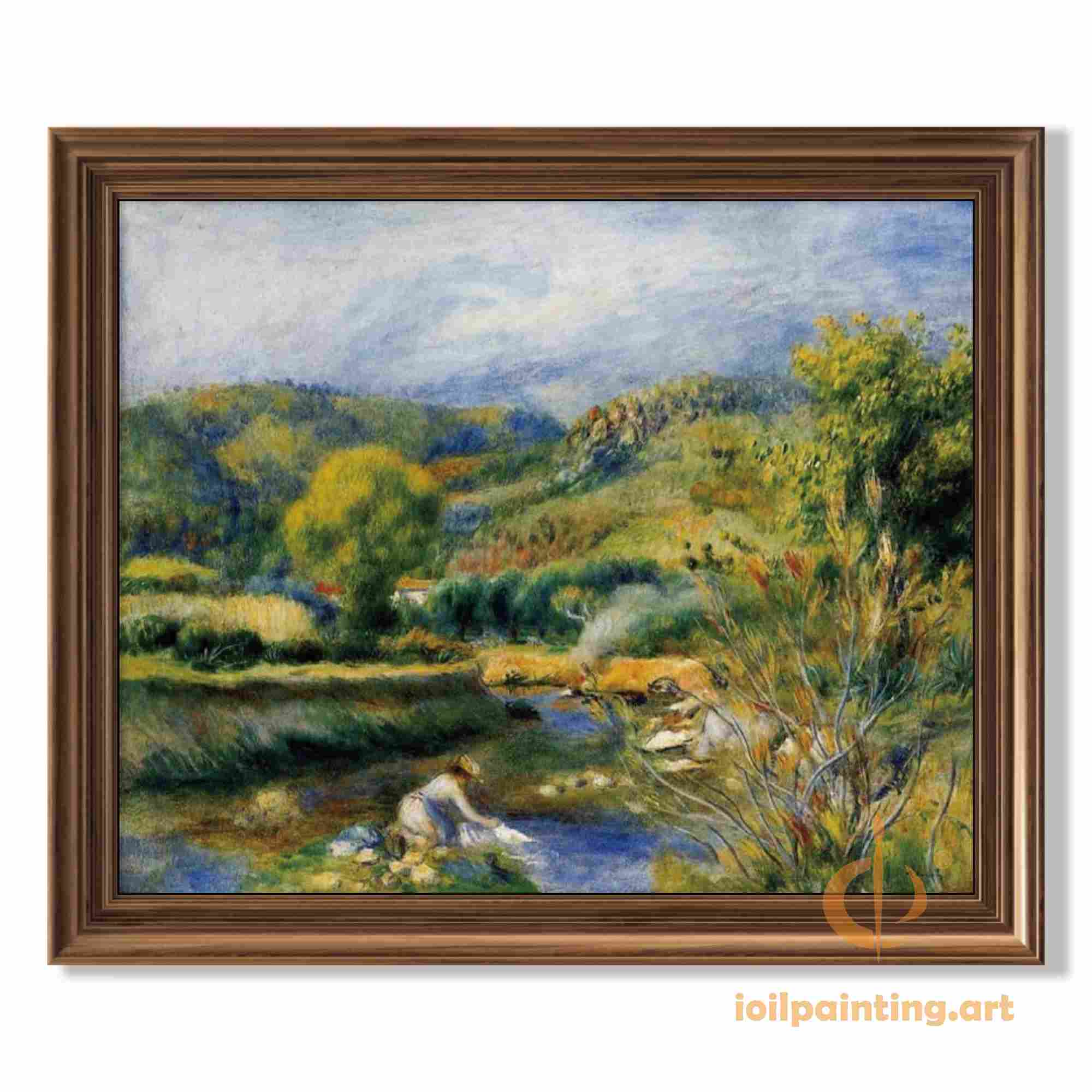 Step into Pierre-Auguste Renoir's idyllic countryside with this exquisite hand-painted reproduction of The Washerwoman. This breathtaking artwork captures the simple beauty of rural French life - a laundress in a crisp white blouse and blue skirt kneels by a gently flowing stream, her hands immersed in the clear water as she tends to her daily chores amidst lush greenery and charming rustic houses.