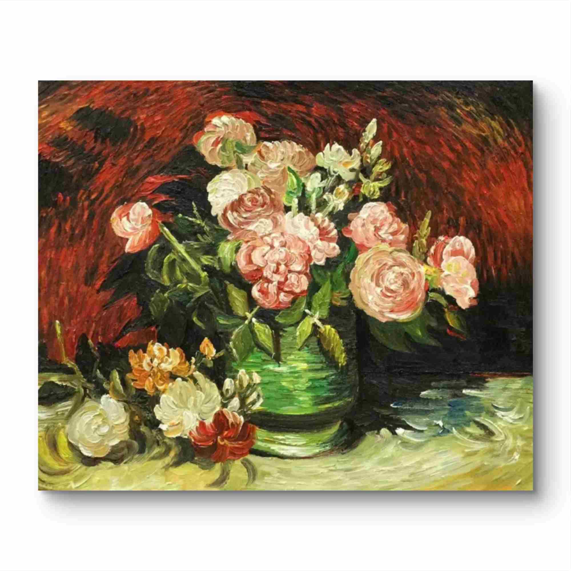 Immerse yourself in the vibrant world of Vincent van Gogh with this exquisite hand-painted reproduction of a stunning floral still life. This breathtaking artwork captures the Dutch master's signature post-impressionist style, featuring a lush bouquet of delicate pink, white and golden-orange blooms bursting from an elegant emerald-green vase, set against a dramatic crimson background that makes the flowers leap to life.