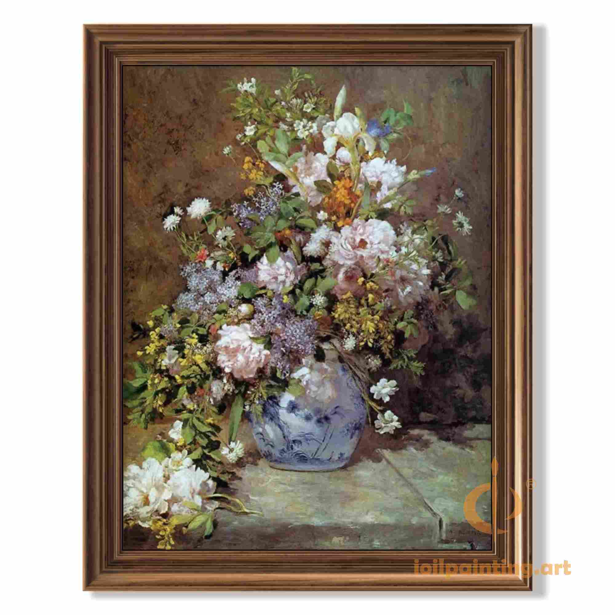 Bring the timeless beauty of Dutch still life painting into your home with this exquisite hand-painted reproduction inspired by Vincent van Gogh's floral works. This breathtaking artwork features a stunning blue-and-white porcelain vase overflowing with a vibrant bouquet of peonies, daisies, and lilacs, their delicate petals captured with remarkable detail against a rich, earthy background.
