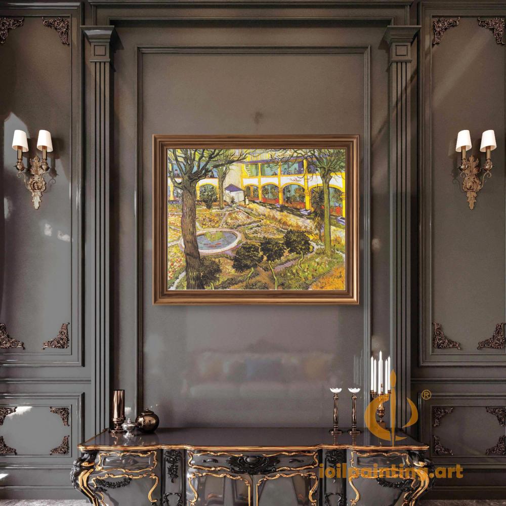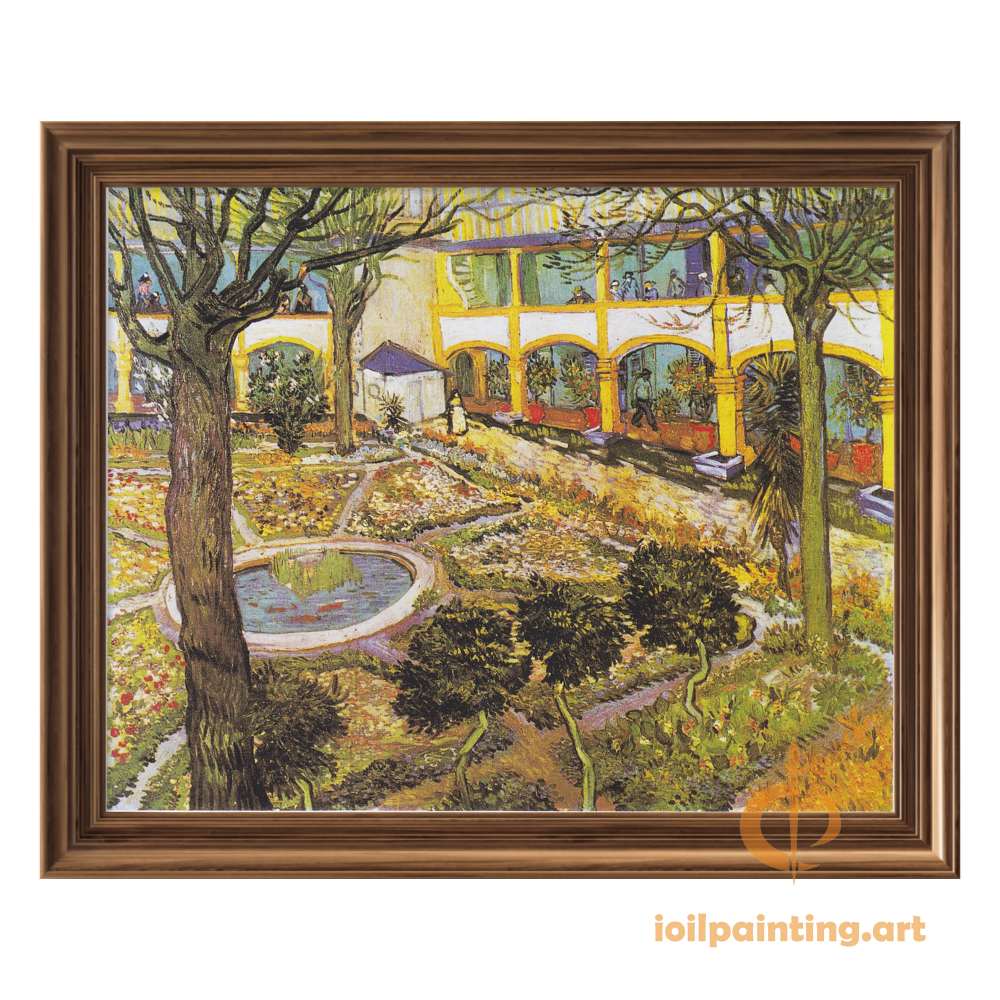 Immerse yourself in the therapeutic beauty of Vincent van Gogh's "Garden of Saint-Paul Hospital" with this exquisite hand-painted reproduction. This breathtaking artwork captures a serene moment in the asylum gardens where Van Gogh found solace during his stay, featuring a majestic tree whose sprawling branches cast dappled shadows over a tranquil circular pond.