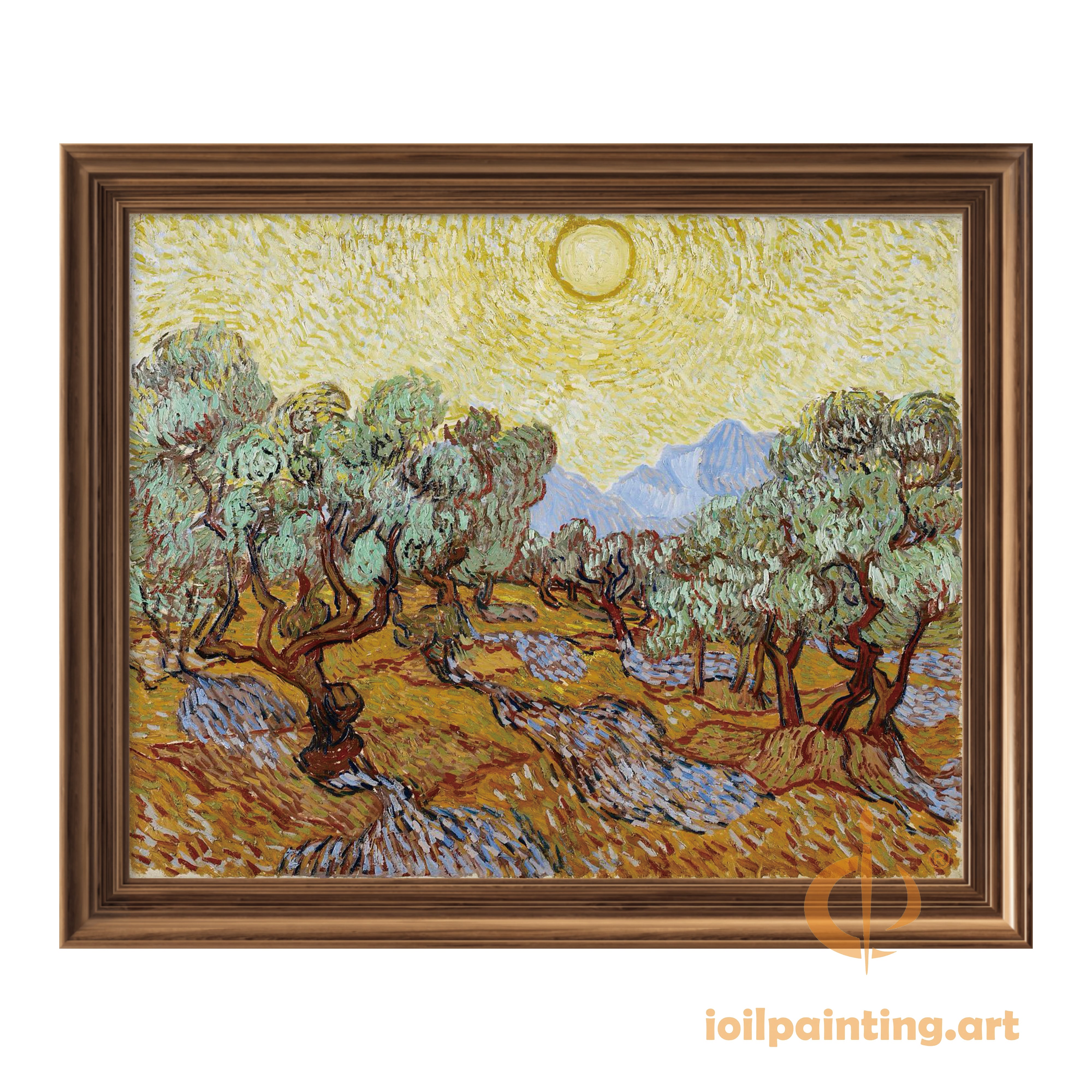 Immerse yourself in the radiant beauty of Provence with this exquisite hand-painted reproduction of Vincent van Gogh's "Olive Grove with Yellow Sun." This breathtaking artwork captures the Dutch master's revolutionary vision of the Mediterranean landscape, where gnarled olive trees twist dramatically against a luminous yellow sky, their silver-green leaves shimmering beneath a radiant sun that pulses with Van Gogh's signature swirling energy.