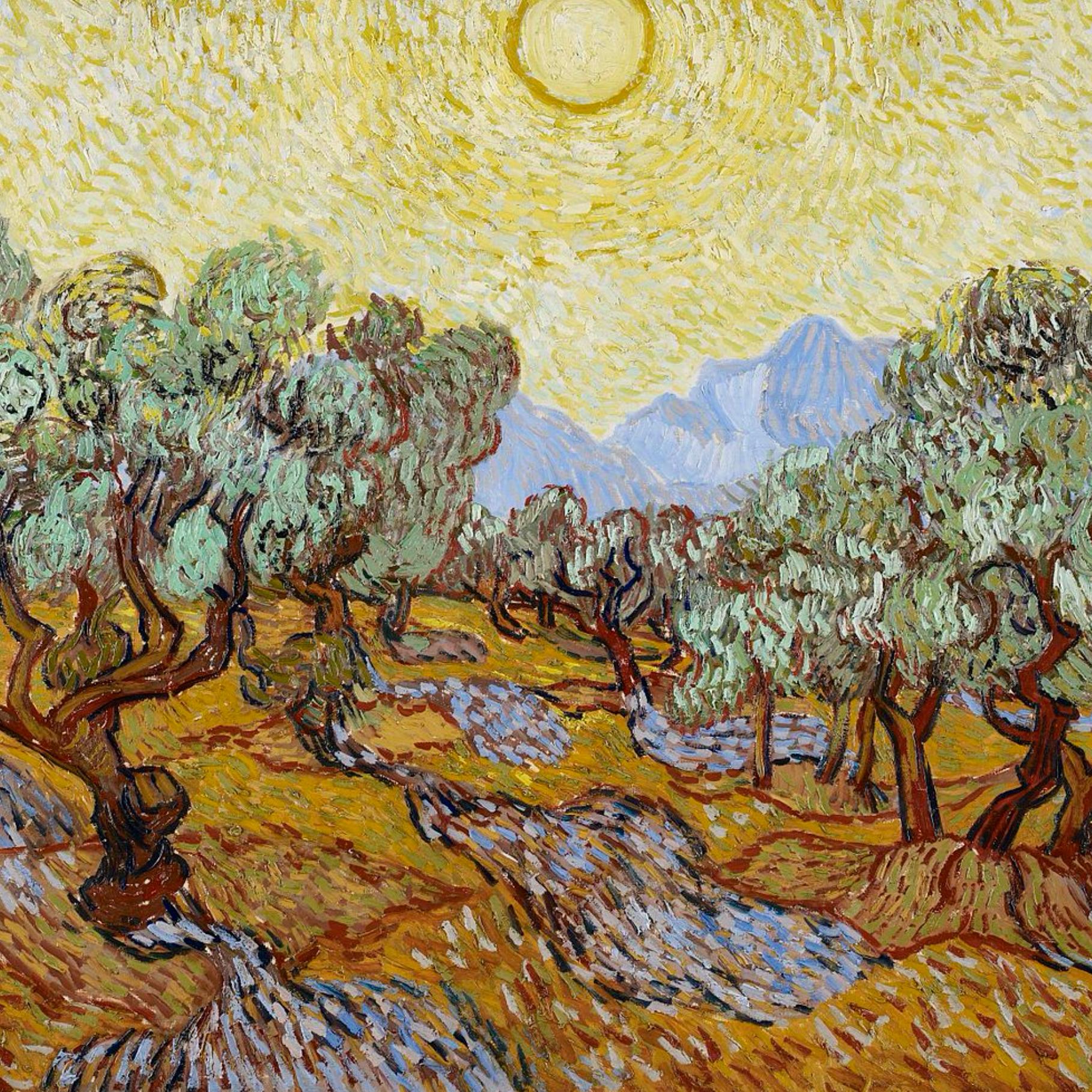 • Van Gogh's iconic thick, undulating brushstrokes that make each twisted trunk and leaf come alive