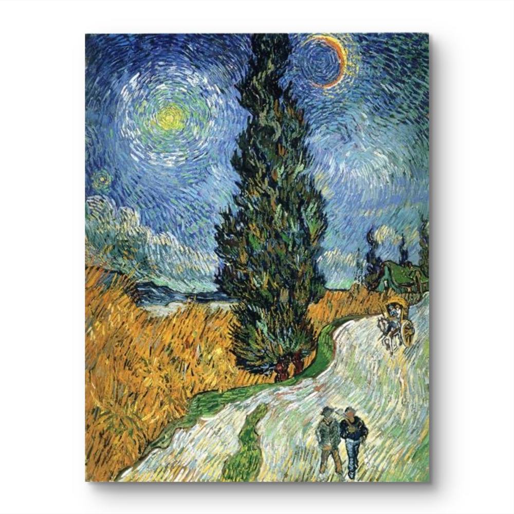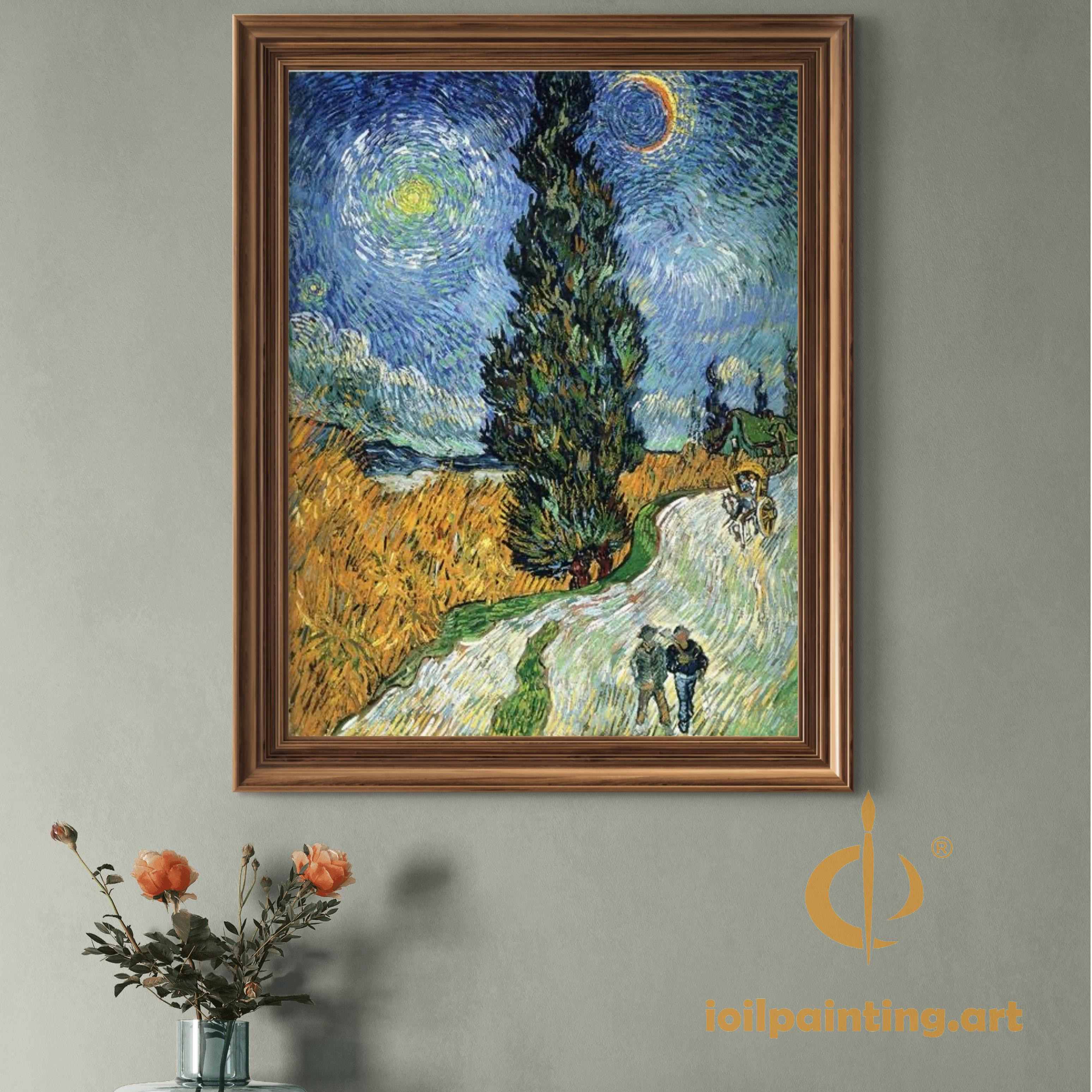More than decor—this is a portal to Van Gogh's passionate vision of nature. The composition's rhythmic energy draws your eye along the winding road, where each brushstroke conveys the artist's profound connection to the land. Notice how the painting seems to change with daylight, revealing new depths in its layered surface.