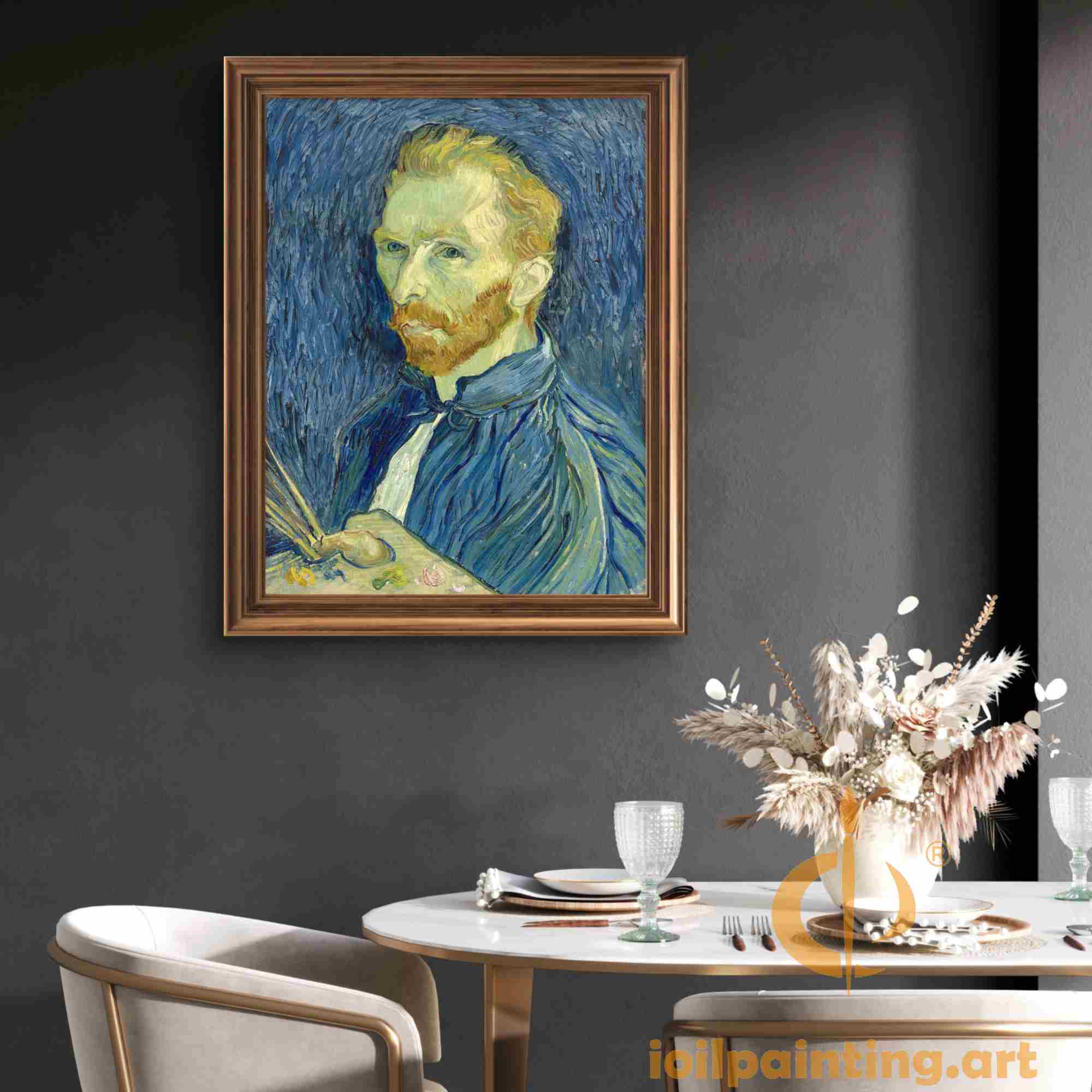 • Van Gogh's signature thick, directional brushstrokes that make each facial feature vibrate with life